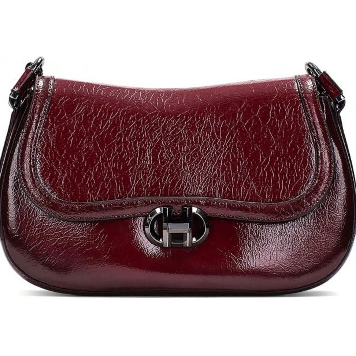 Das Obermaterial dieser Handtasche wurde aus hochwertig verarbeitetem Kunstleder in Rot gefertigt und mit einem glänzenden Lack Finish versehen. Das kompakte Format dieser Tasche in Verbindung mit der raffinierten Dornschließe zieht garantiert die Blicke auf sich.