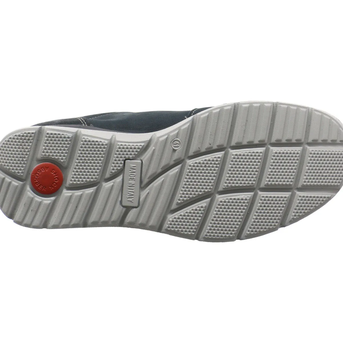 Gefertigt aus hochwertigem Nubukleder in dunklem Blau ist er mit einer modischen Overlay Struktur versehen, welche durch helle Ziernähte in Grau und Einsätze in hellem Braun gekonnt in Szene gesetzt wird.