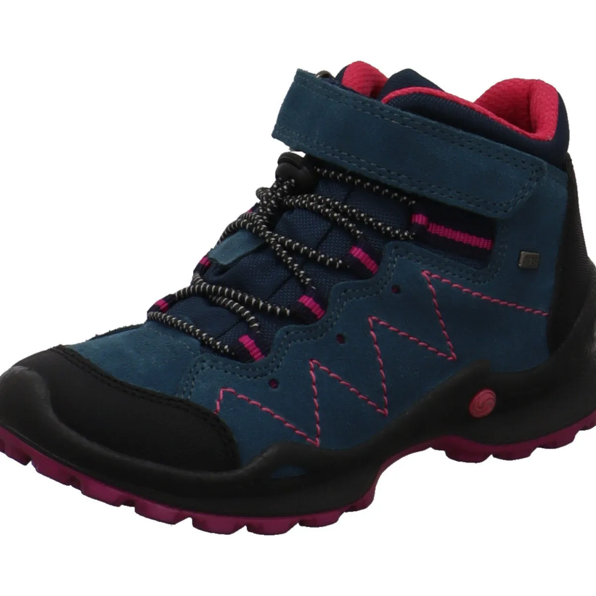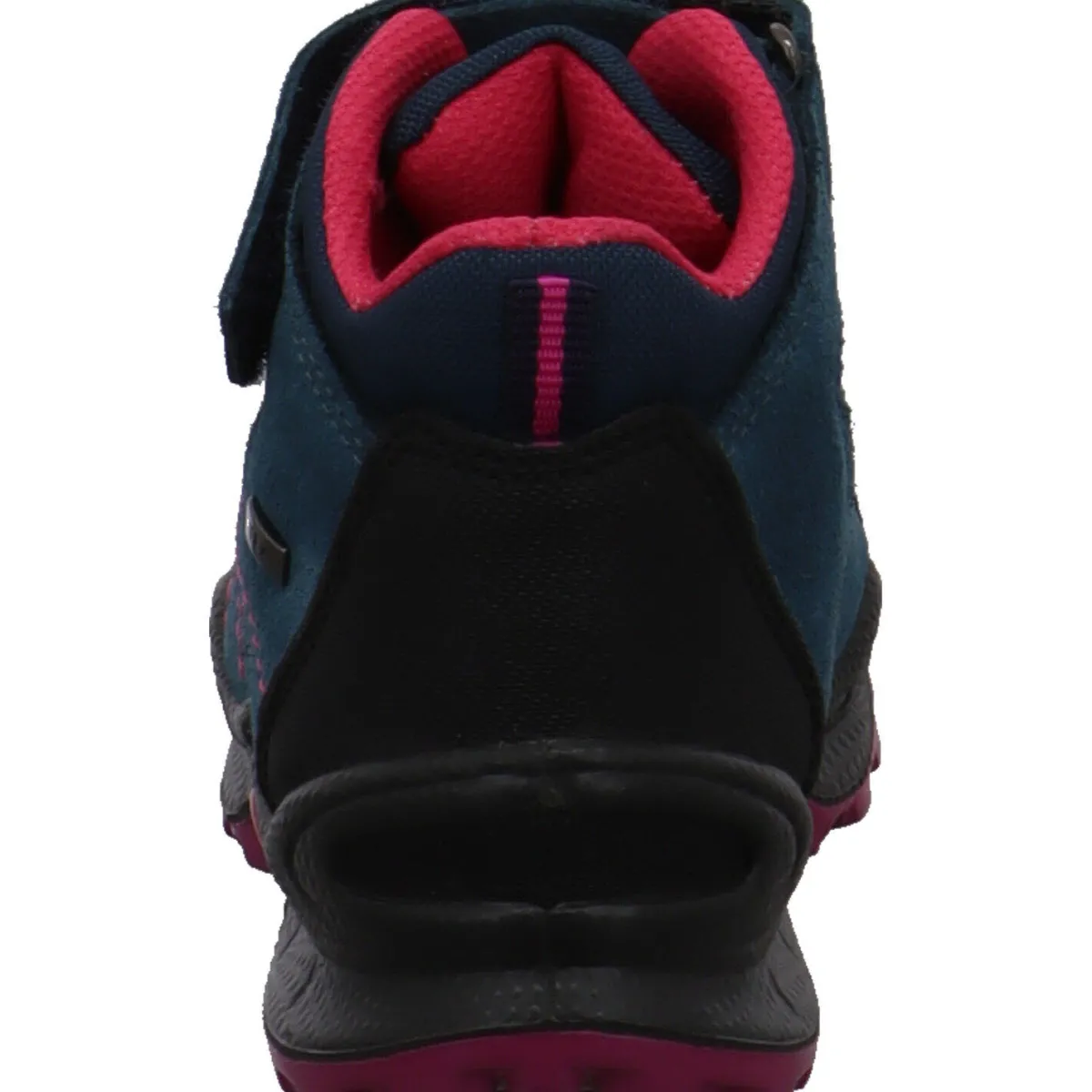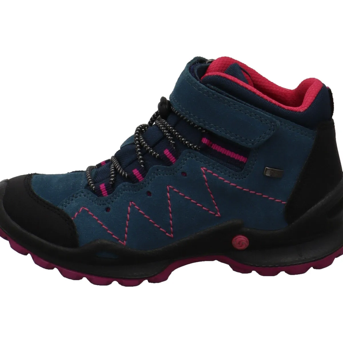 Der Schuh begeistert durch seinen Mix aus Veloursleder und Synthetik in Blau mit farblichen Akzenten in Pink und Schwarz.