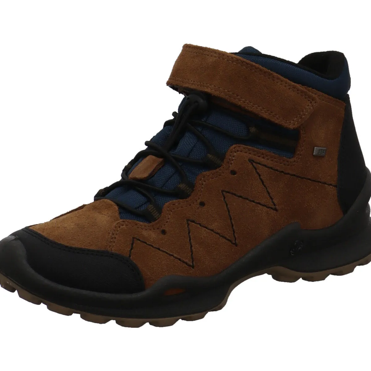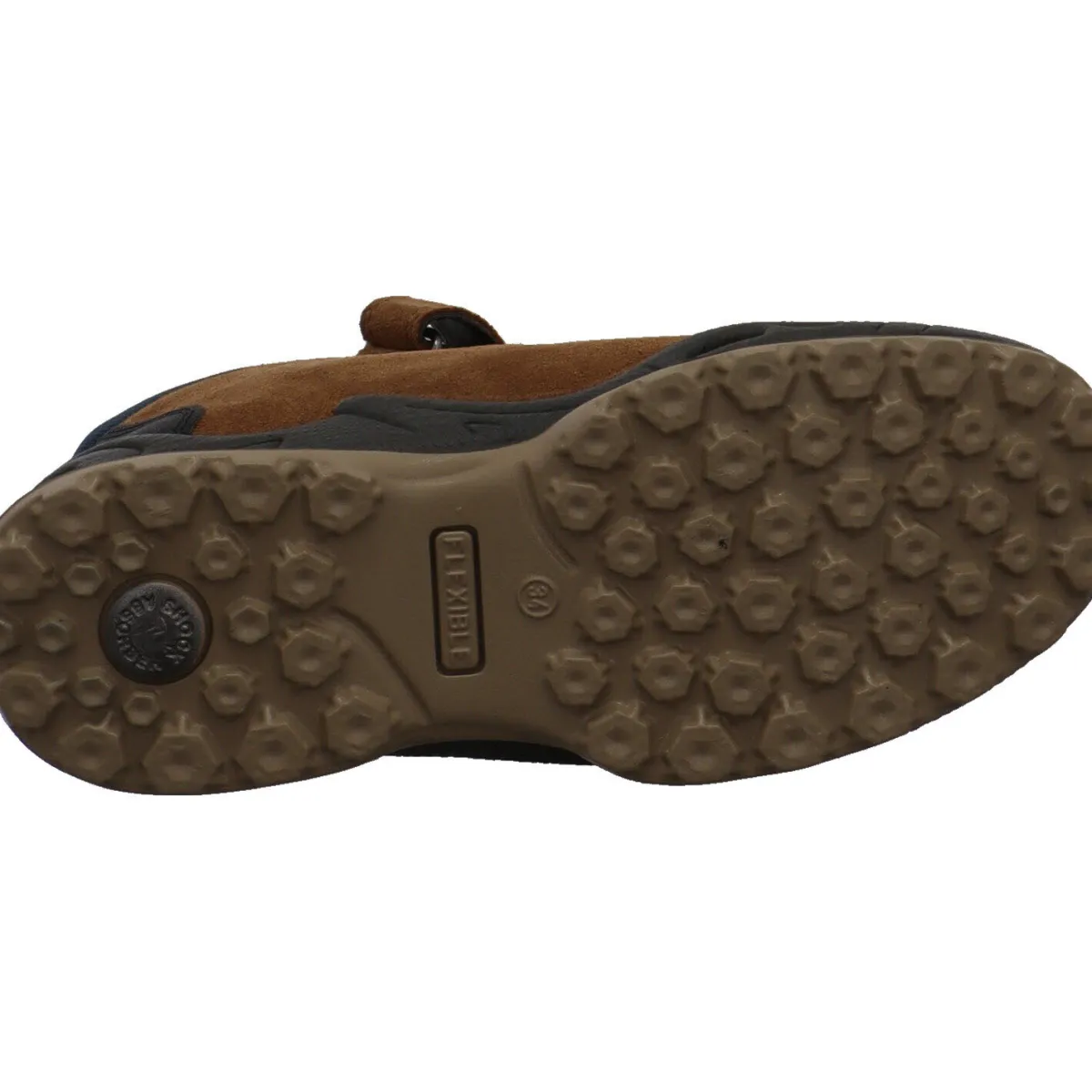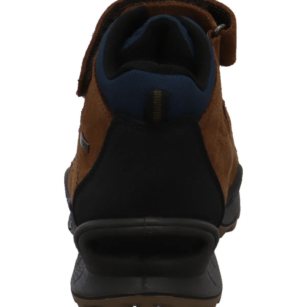 Der Schuh begeistert durch seinen Mix aus Veloursleder und Synthetik in Braun mit farblichen Akzenten in Blau und Schwarz.