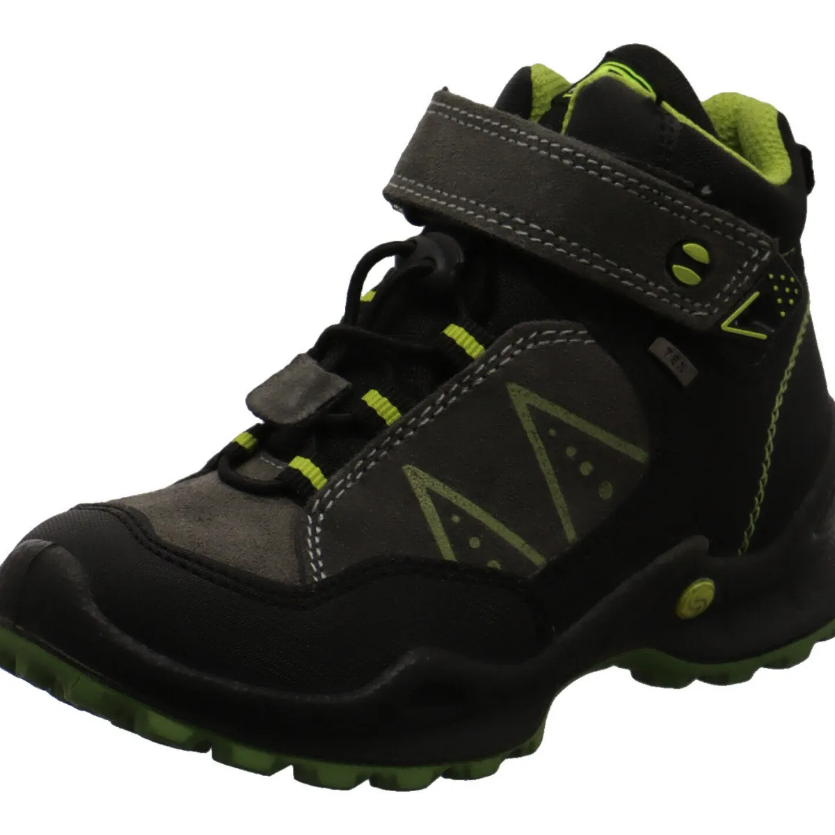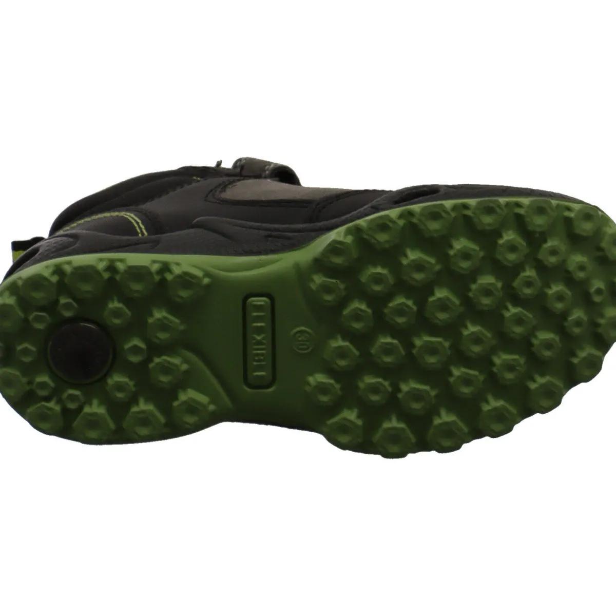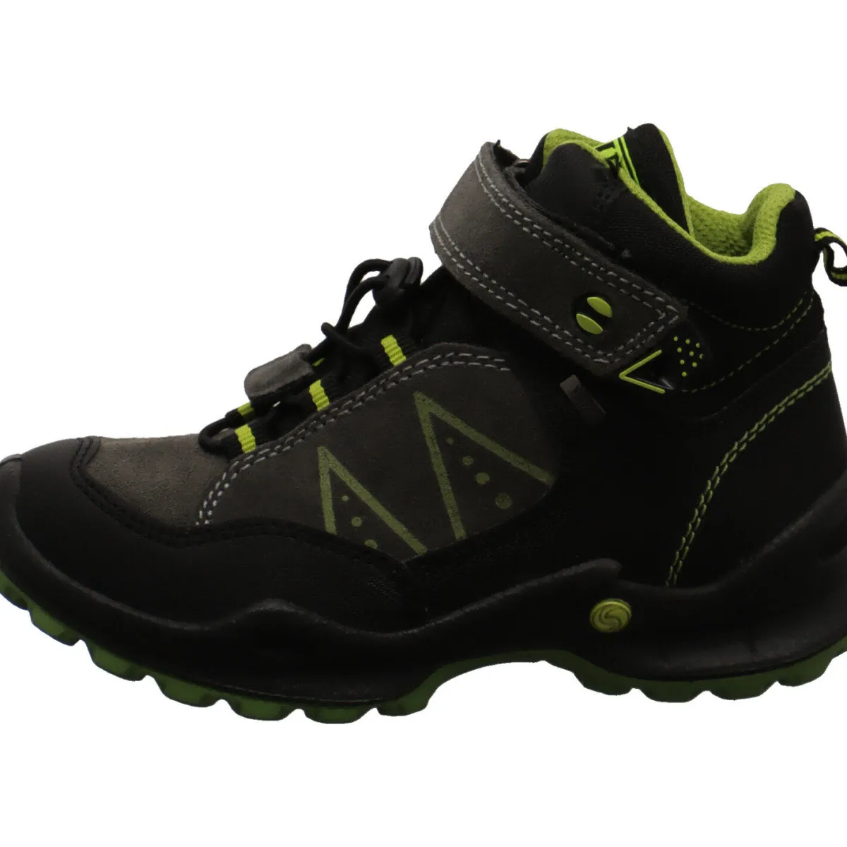 Der Schuh begeistert durch seinen Mix aus Veloursleder und Kunstleder in Grau mit farblichen Akzenten in Grün und Schwarz.