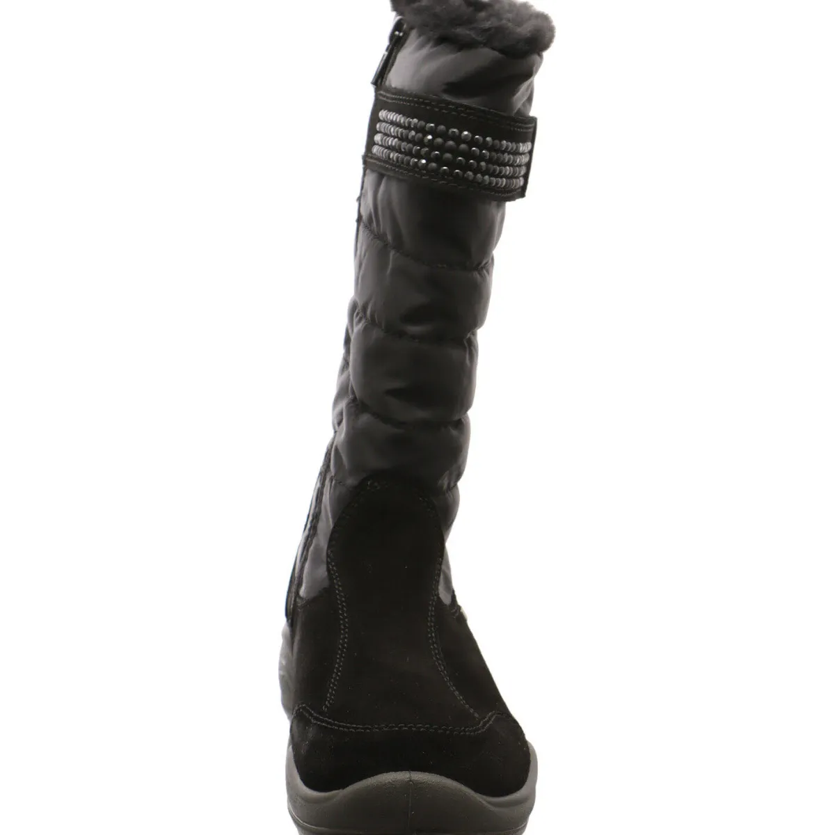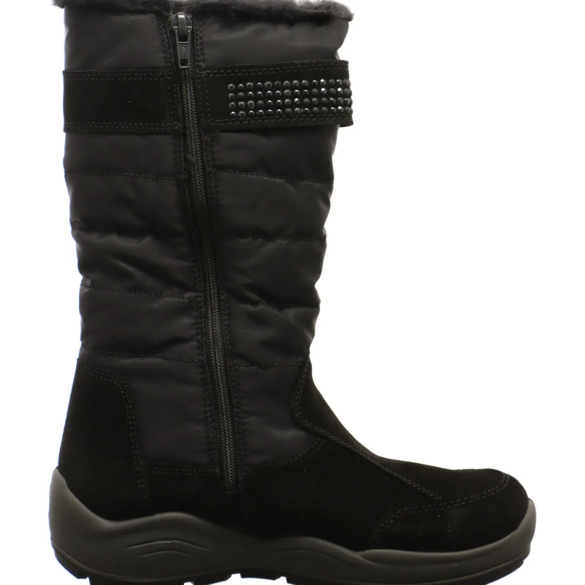 Er wurde aus weichem und hochwertigem Veloursleder in Schwarz gefertigt und mit textilen Parts am Schaft versehen. Der mit glitzernden Steinen versehende Riemen am Schaft, lässt sich in der Weite etwas verstellen.