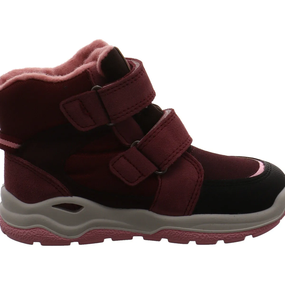 Das Obermaterial aus einem Mix aus Echtleder und Textil in Weinrot gefertigt.