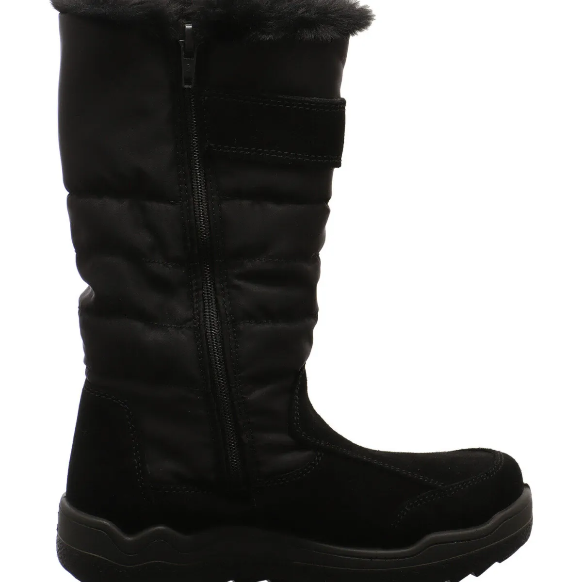 Der Schaft ist gesteppt und mit einem Riemen versehen, dieser hat einen Stern mit Glitzer Steinen, der mit einem Klettverschluss in der Weite variiert werden kann. Die Plüschkante bildet einen tollen Abschluss.