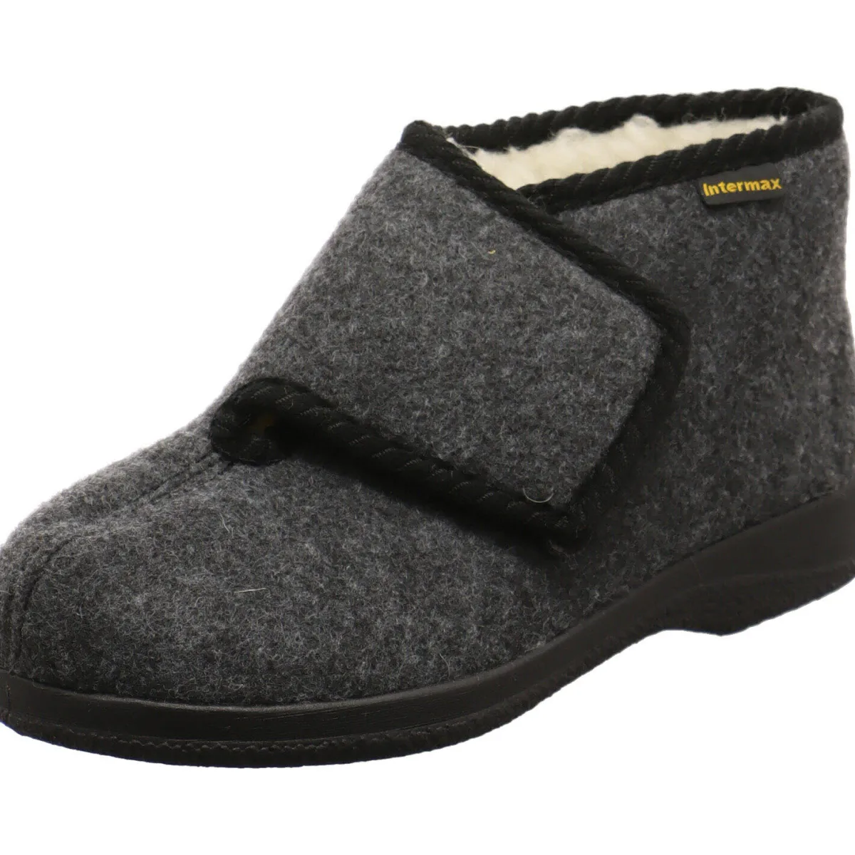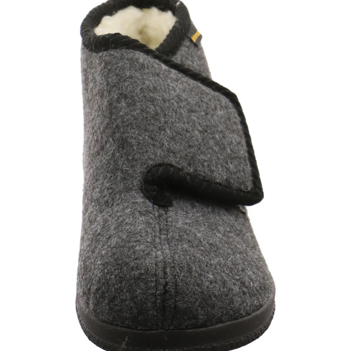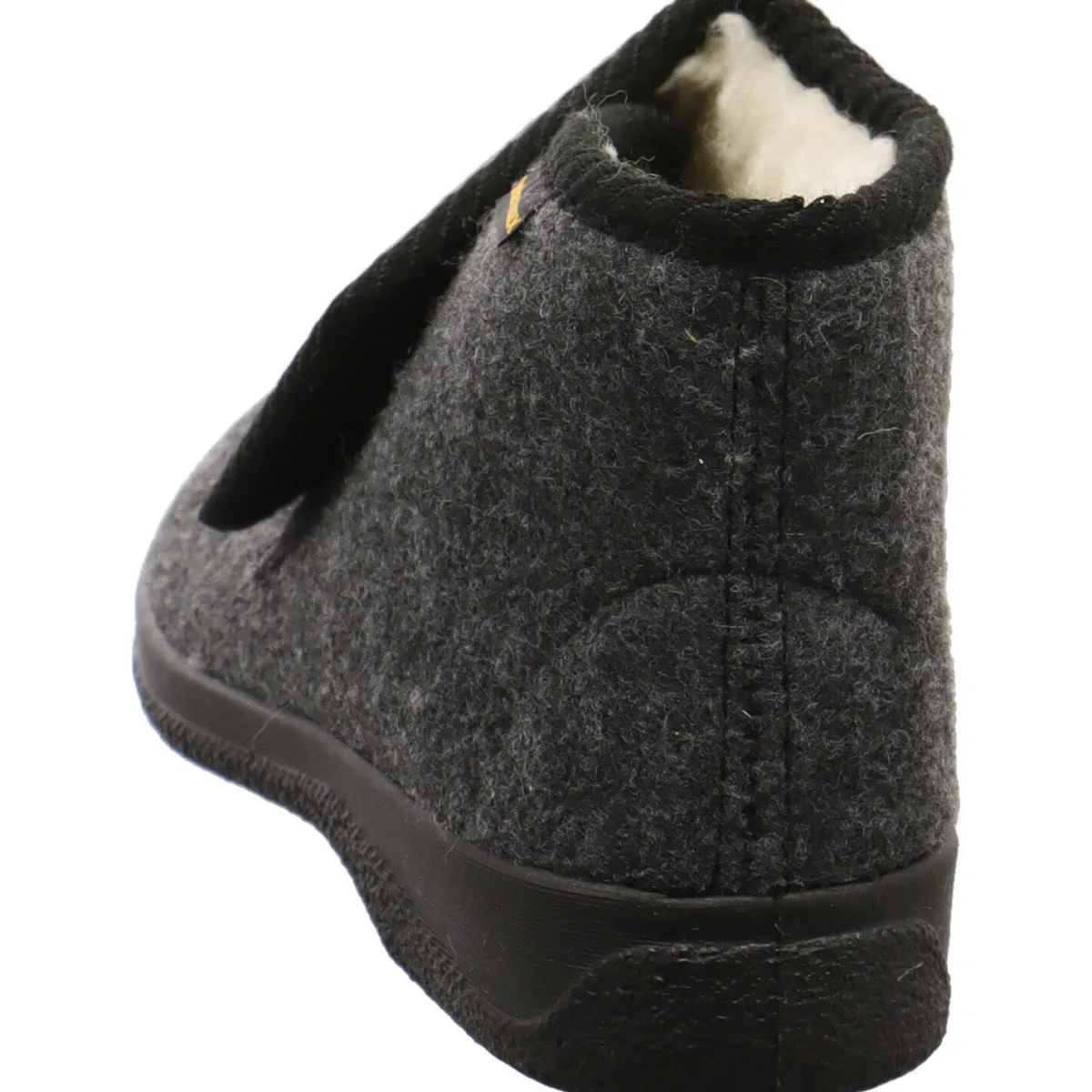 Der Hausschuh ist mit einem mollig warmen Innenfutter aus echter Schurwolle ausgestattet und der einfache Klettverschluss sorgt für eine perfekte Passform.