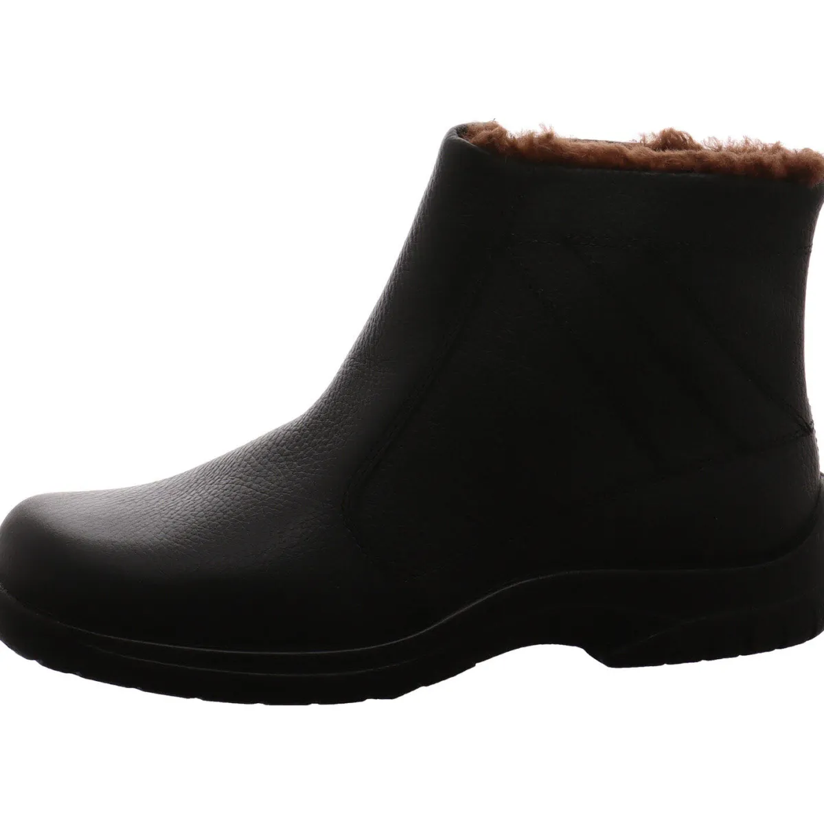 Das Obermaterial aus Echtleder in Schwarz wird durch tonale Ziernähte und die dezente Overlay Optik gekonnt in Szene gesetzt. Das echte Lammfell Innenfutter ist Braun abgesetzt und sorgt dafür, dass Sie auch bei frostigen Temperaturen garantiert keine kalten Füße bekommen.