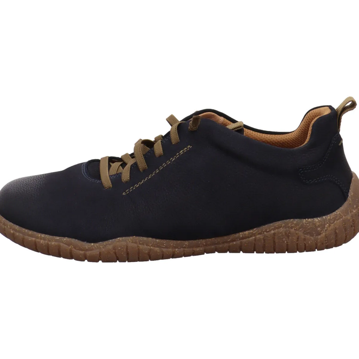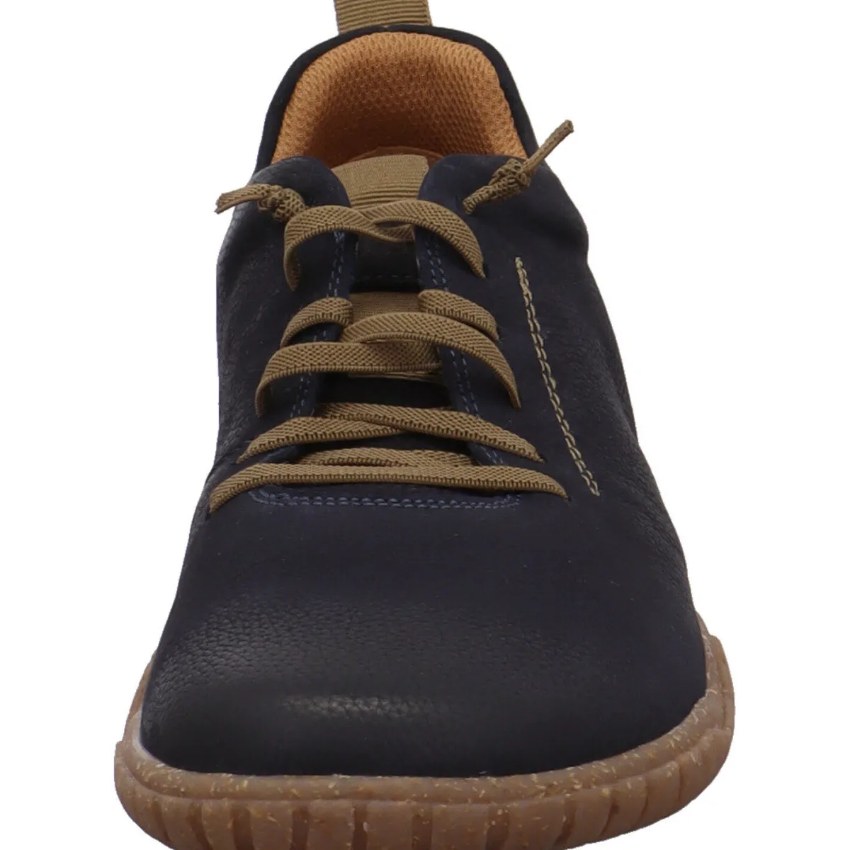Er wurde aus hochwertigem Nubukleder in Blau gefertigt. Durch die Gummischnürung und die Lasche am Schaft ist der Einstieg besonders einfach. Diese und das Innenfutter sind Braun abgesetzt und machen den Schuh zu einem echten Hingucker. Mit seiner komfortablen Schnittführung besonders im Bereich der Zehen vermittelt er ein angenehmes Barfuß Feeling.
