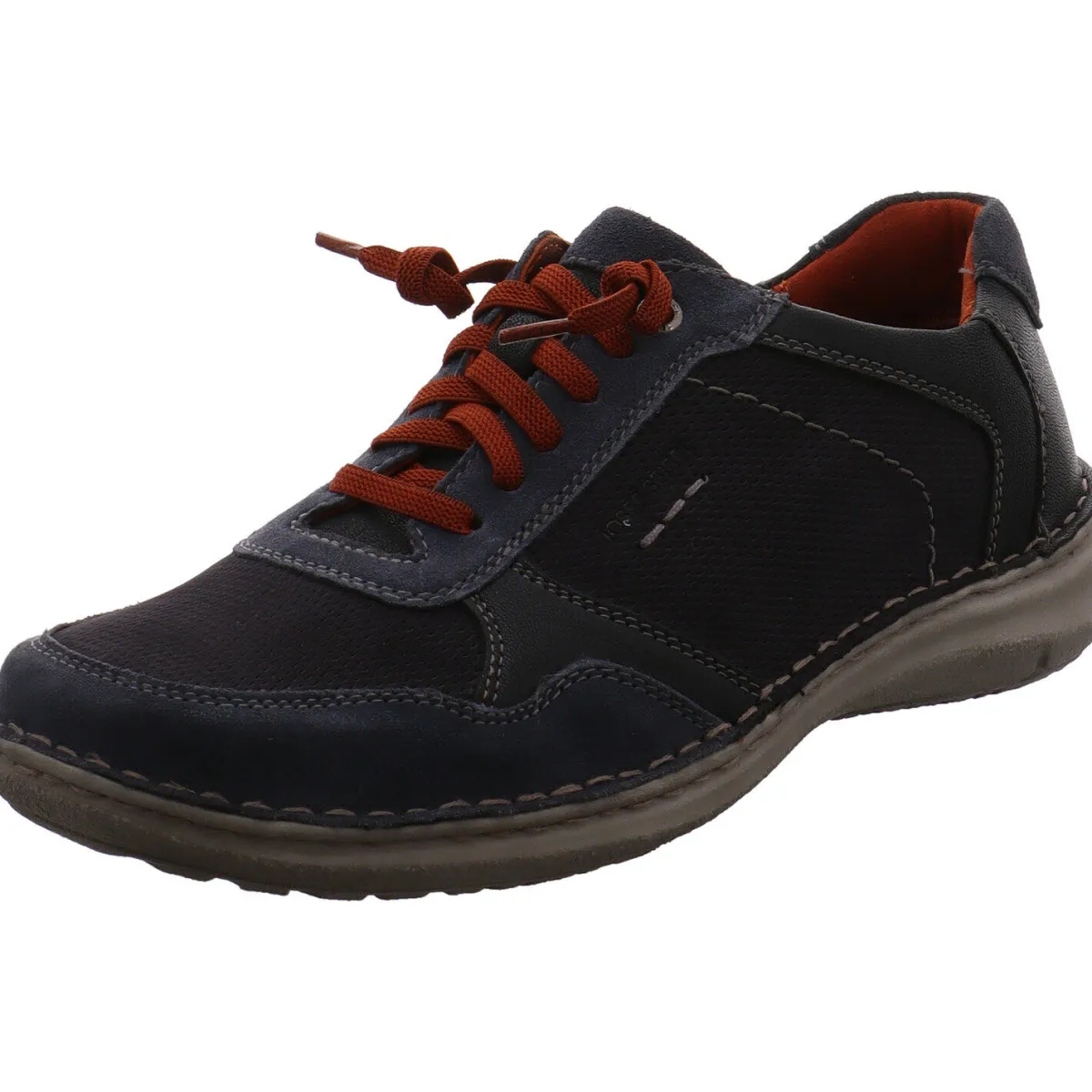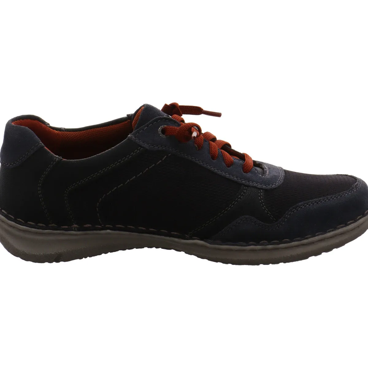 Das Obermaterial aus Echtleder in Blau begeistert durch seine unterschiedlichen Haptiken aus Glattleder und Veloursleder. Zusätzlich ist er mit einer Prägung versehen, die ihm das gewisse Etwas verleiht. Hingucker sind außerdem die Schnürung und das Innenfutter in Rot. Dank der Gummischnürung ist der Einstieg besonders leicht. Die Innensohle ist als Wechselfußbett gearbeitet, so können auch eigene Einlagen verwendet werden. Durch die extra Weite Schnittform bietet er den Füßen deutlich mehr Platz und komfort. Ein toller Schuh für den Alltag.