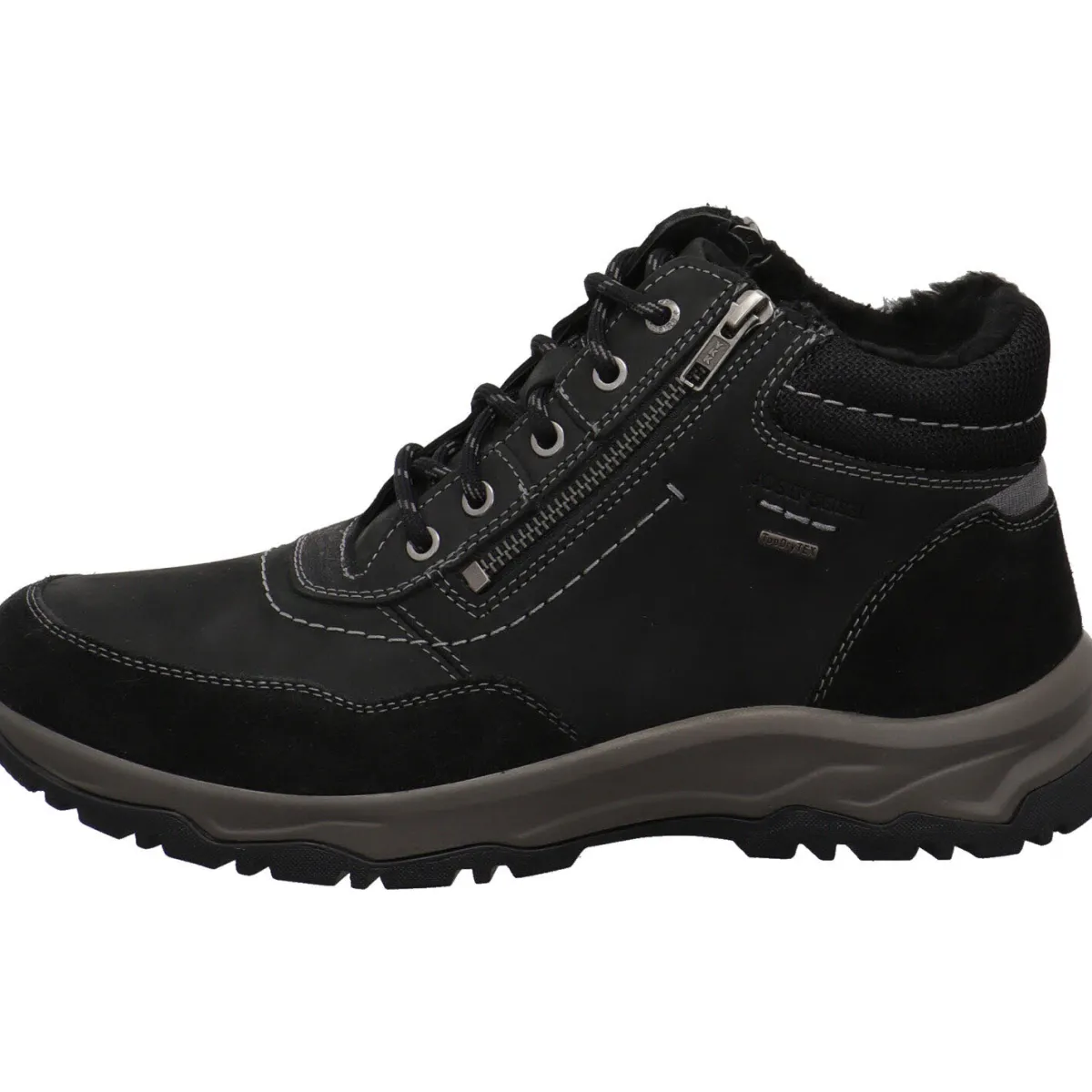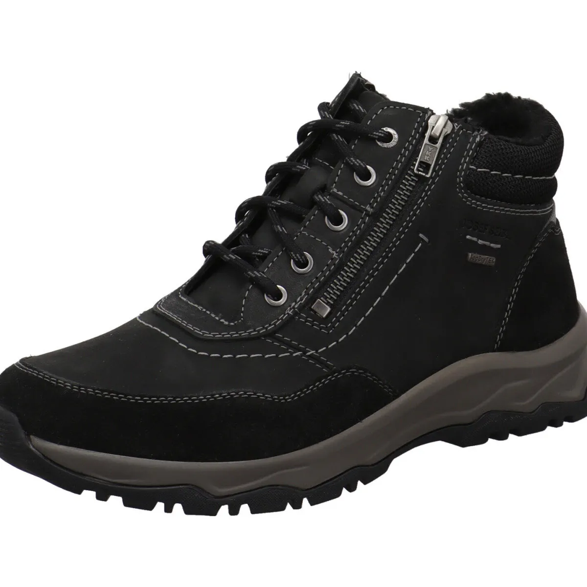 Sie wurde aus einem Mix aus hochwertigem Echtleder und Textil in Schwarz gefertigt. Helle Zierähte und unterschiedliche Haptiken, bringen das moderne Design toll zur Geltung. Der Schaft ist aus Textil und angenehm weich gepolstert. Durch den doppelten Reißverschluss ist der Einstieg ganz einfach und mit der Schnürung kannst du ihn genau auf deine Bedürfnisse anpassen. Das Innenfutter ist angenehm flauschig und dank der TopDry Tex Membran ist er dauerhaft wasserdicht, dennoch atumungsaktiv und absolut winddicht.