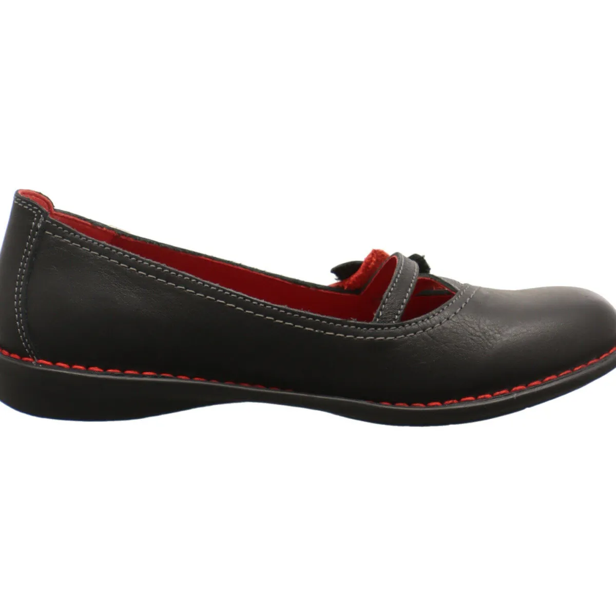 Dieser schöne Damen Ballerina in Schwarz mit Akzenten in Rot beigeistert durch sein ungewöhnliches Design und ist ein Schuh zum wohlfühlen. Die Blume auf dem Blatt ist ein besonders schönes Detail.