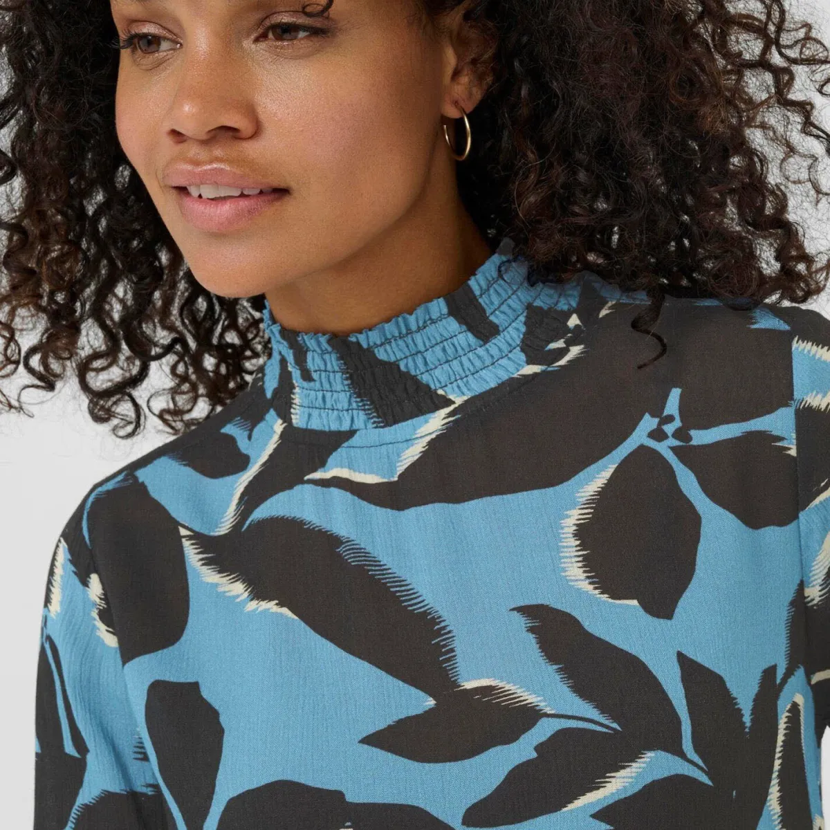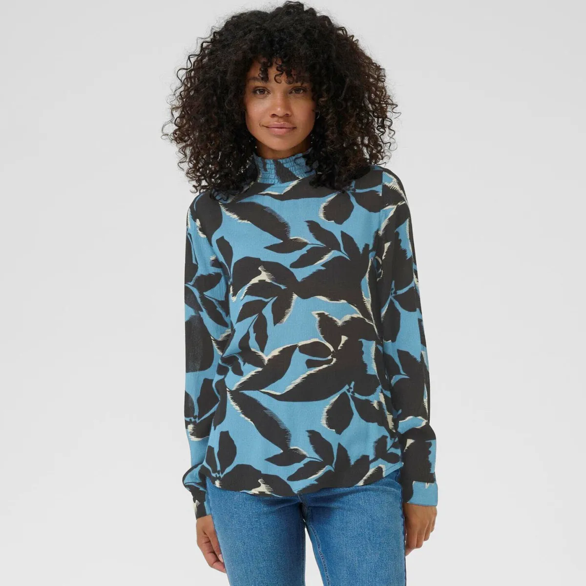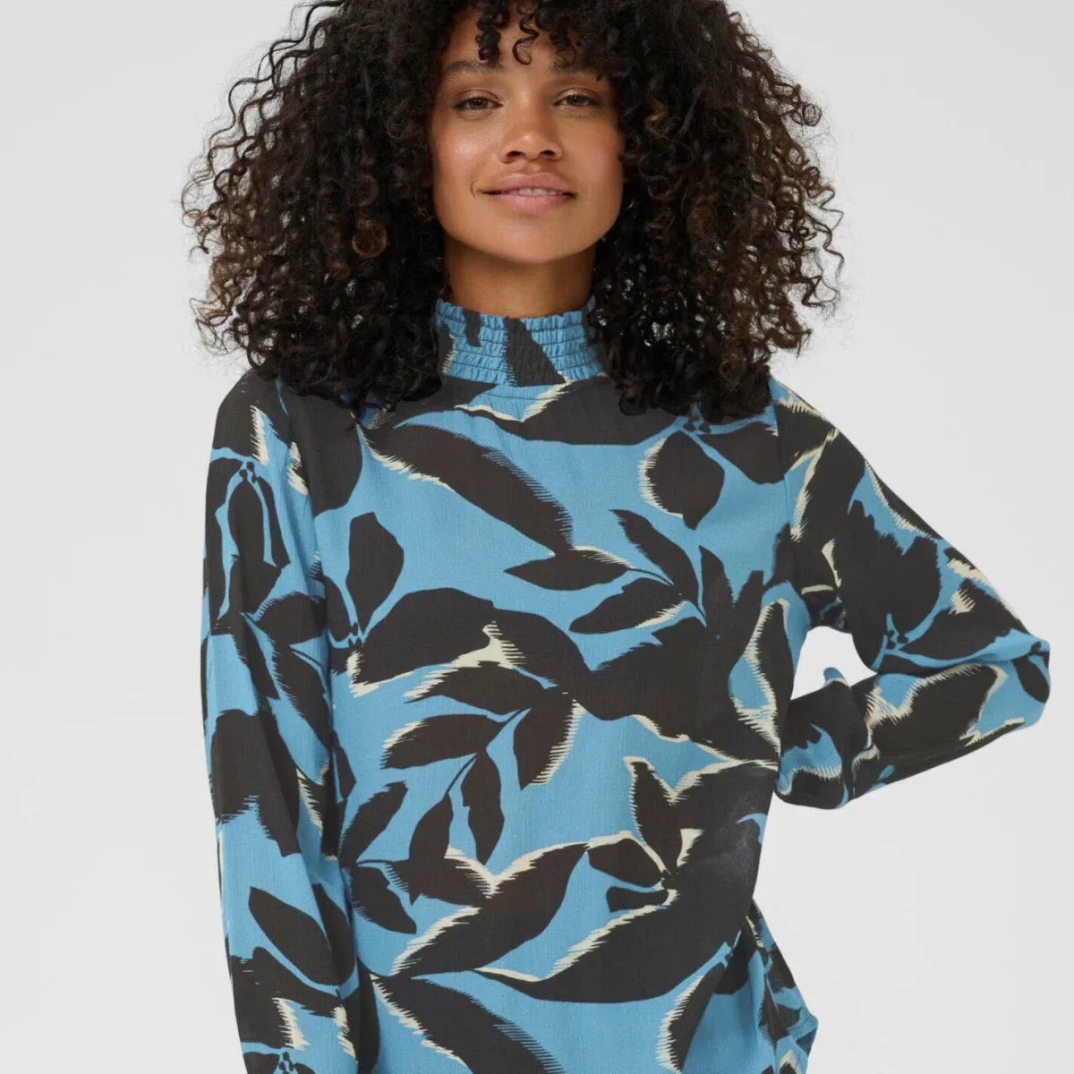 Der leichte, fließende Viskose Stoff in Blau ist mit einem Print in Schwarz, mit Blättern verziert und verleiht ihr einen verspielten Look.