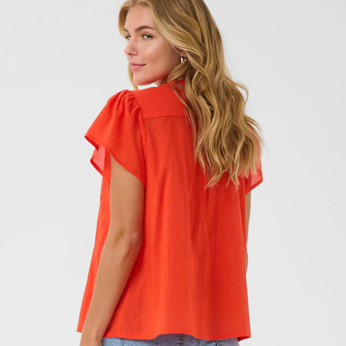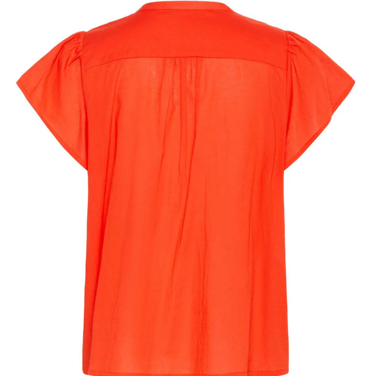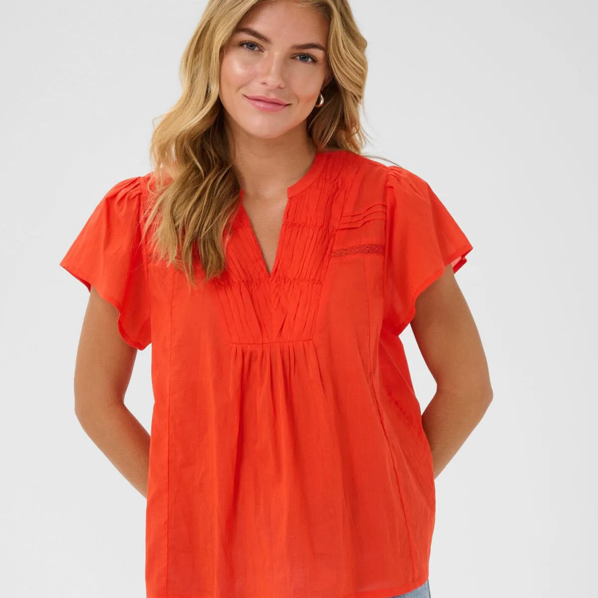 Die kurzen Ärmel und der Ausschnitt sind mit kleinen Plisseefalten versehen. Wodurch der romatische Look erzeugt wird und die Ärmel einen luftig fließenden Schnitt haben. Die Bluse hat einen normalen Schnitt und passt super zu deinem Sommer Look.