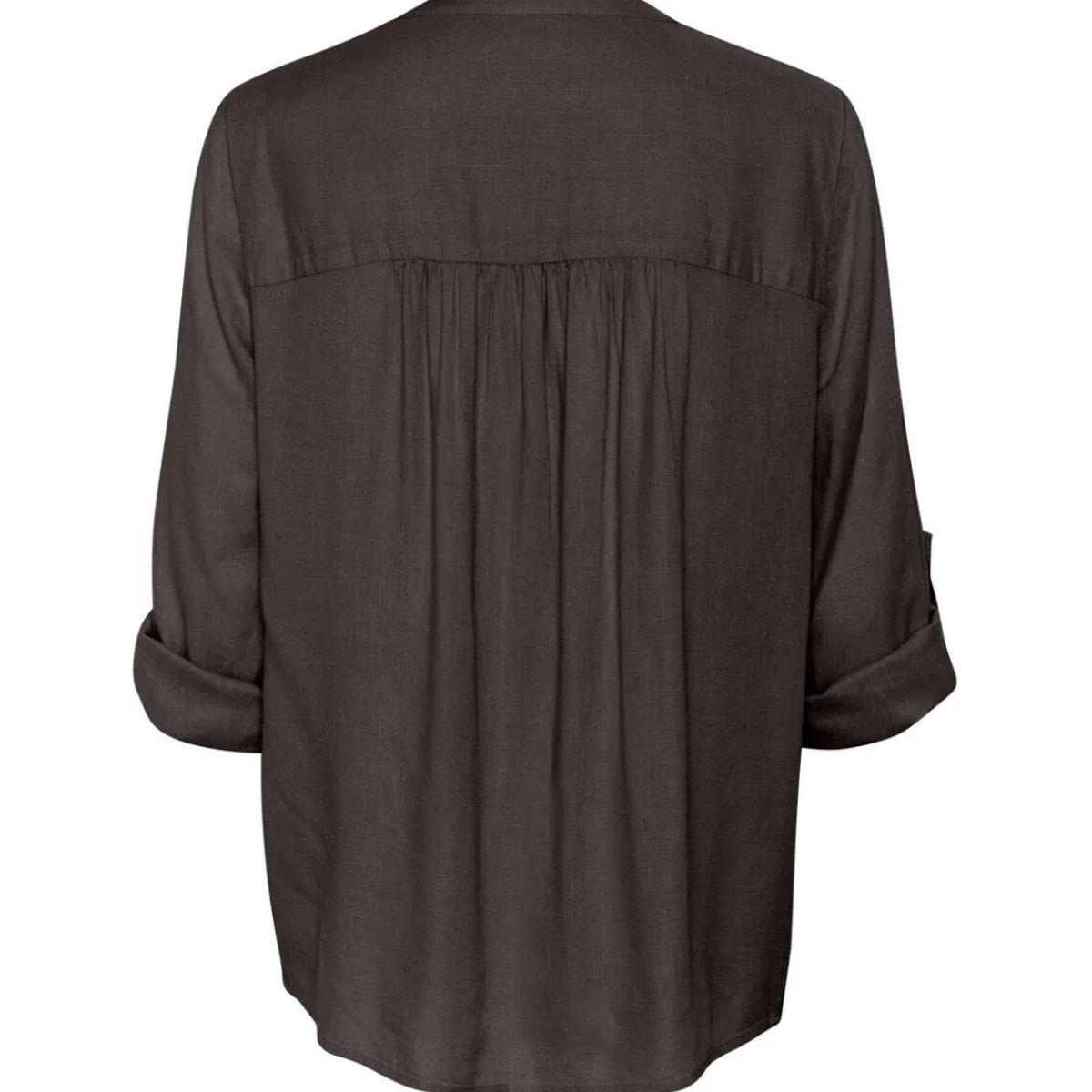 Sie wurde aus einem hochwertigen Mischgewebe in Schwarz gefertigt. Besonders gefällt uns der große Anteil an Leinen. So kannst du sie auch an warmen Tagen tragen, da sie angenehm luftig und leicht ist. Der V-Ausschnitt ist zusätzlich mit einer Knopfleiste verziert. Die langen Ärmel sind locker und mit einer Manschette versehen. Zusätzlich sind Rollmanschetten vorhanden, so kann sie auch lässig mit einem 3/4 Ärmel getragen werden. Im Rücken ist eine Passe mit Falten eingearbeitet. Diese bieten dir zusätzliche Bewegungsfreiheit. Der Regular Fit Schnitt rundet das perfekt ab. Eine bequeme und gut zu kombinierende Bluse für den Frühling und Sommer.