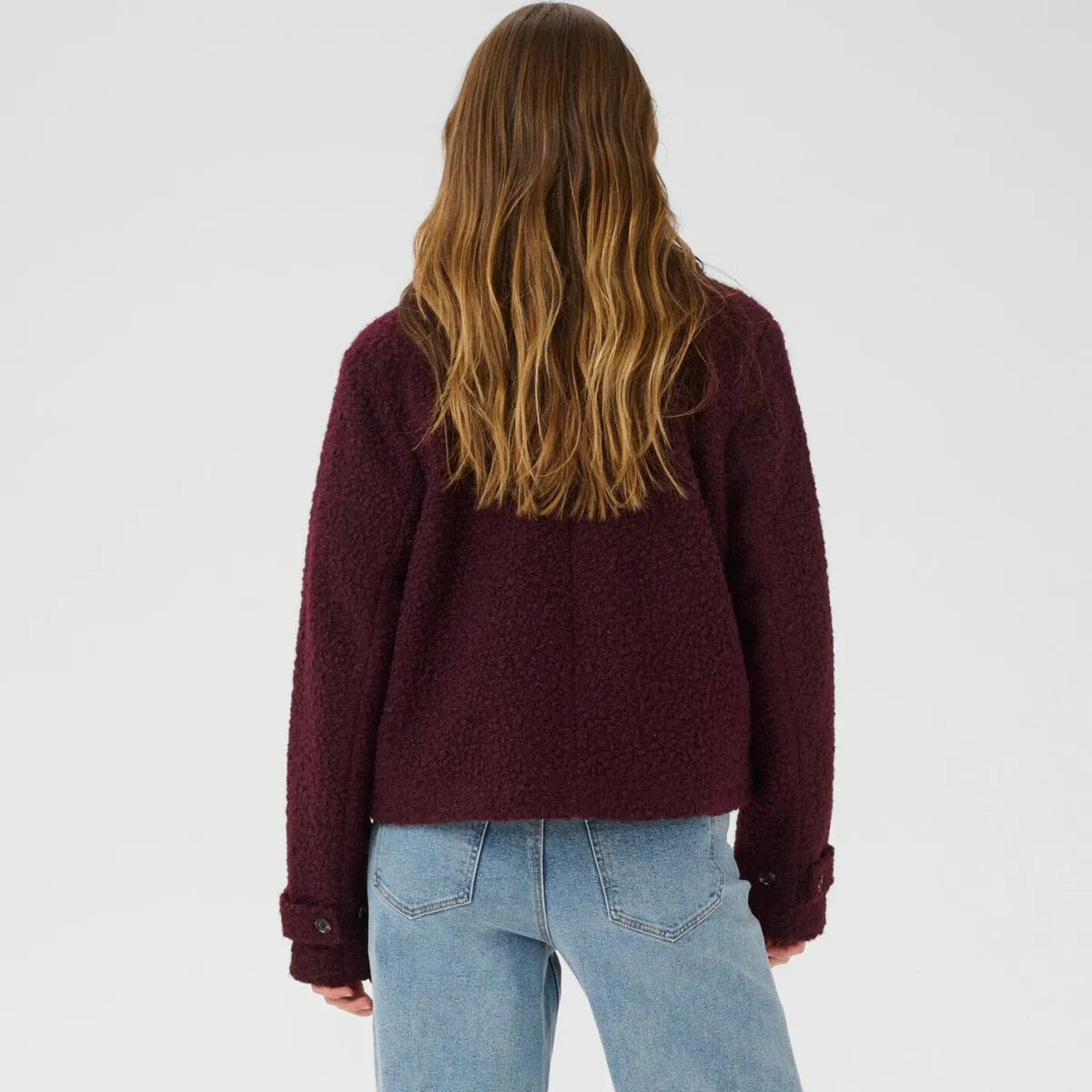 Das Material ähnelt einem Bouclestoff und ist besonders kuschlig. Mit ihrem breiten Reverskragen und dem doppelt geknöpften Verschluss, harmoniert sie perfekt zu jedem Outfit. Ob nun eine weit geschnittene Jeans oder elegant zum Rock.
