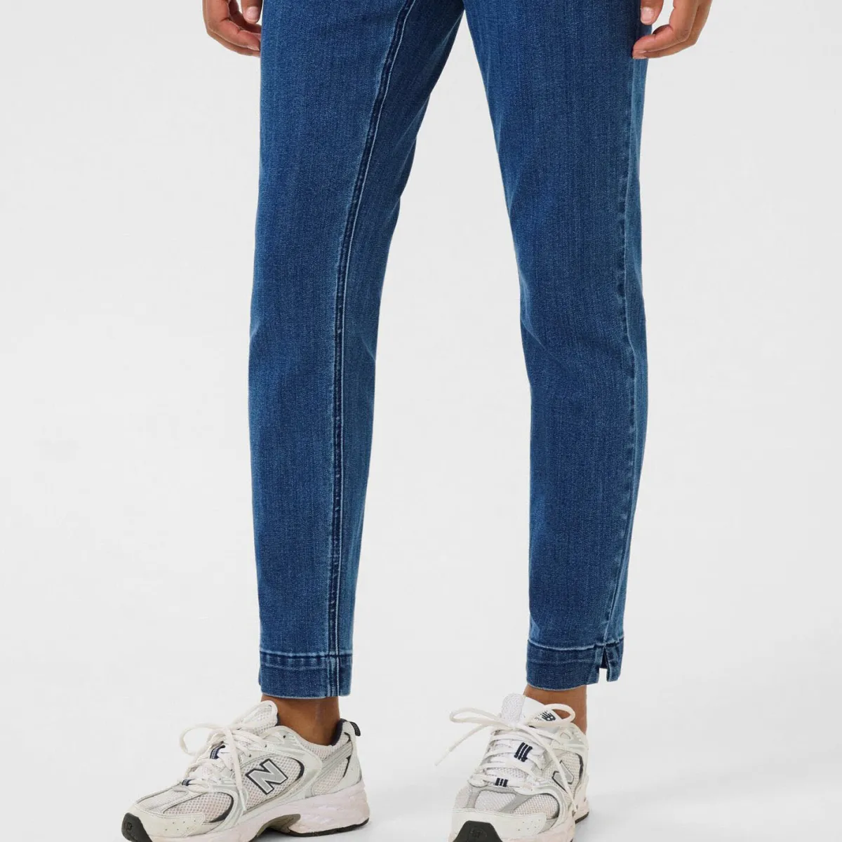 Der Denim Stoff in Blau lässt sich super kombinieren. Die Jeans ist Regular Fit geschnitten und hat schmale Beine. Sie hat seitliche Taschen und auf dem Gesäß zwei Paspeltaschen. Sie wird mit einem Riegel und Reißverschluss geschlossen und besitzt Gürtelschlaufen.