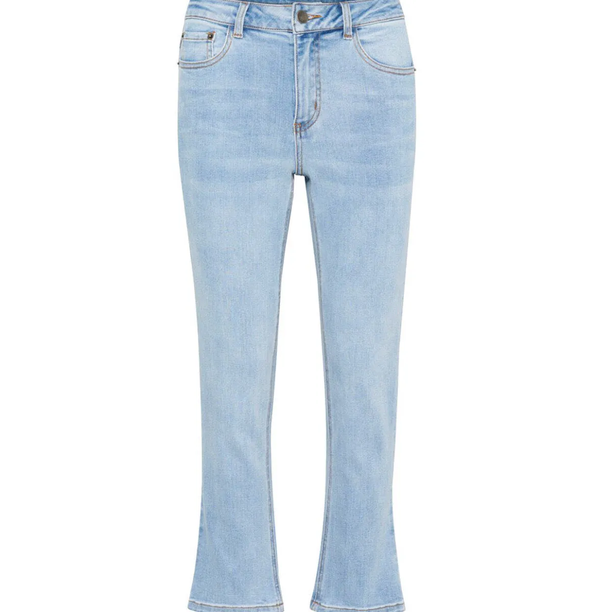 Der helle Denim Stoff in Blau lässt sich super kombinieren. Die Hose hat einen Regular Fit Schnitt. Einen Bund mit Gürtelschlaufen und die typischen 5 Taschen. Und das leicht ausgestellte Bein mit Knöchellänge verleiht ihr einen besonderen Look.