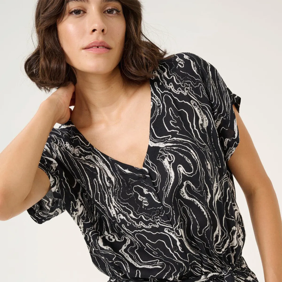 Der leichte Viskose Stoff in Schwarz ist mit einem individuellen Muster mit Weiß versehen. Der Jumpsuit hat kurze Ärmel und einen V-Auschnitt.