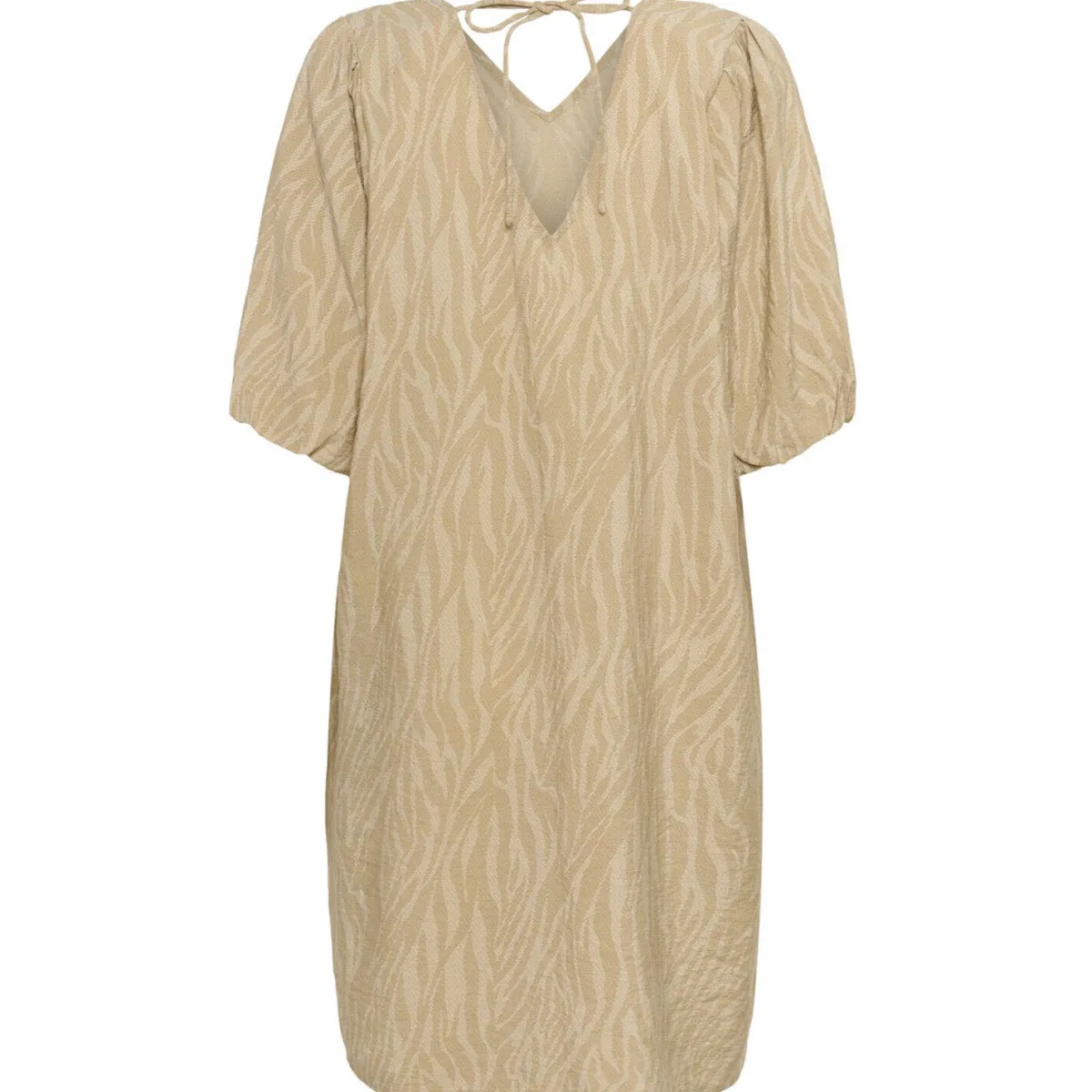 Das Viskose Mischgewebe in Beige ist luftig leicht und im Loose Fit Schnitt gearbeitet. Hingucker ist dabei der Chinchilla Animal Print. Es hat einen V-Ausschnitt und auf der Rückseite zwei Bänder, die zu einer Schleife gebunden werden können und zusätzlichen Halt geben. Die kurzen Ärmel haben einen Gummibund eingearbeitet und haben so einen tollen Fall am Arm.