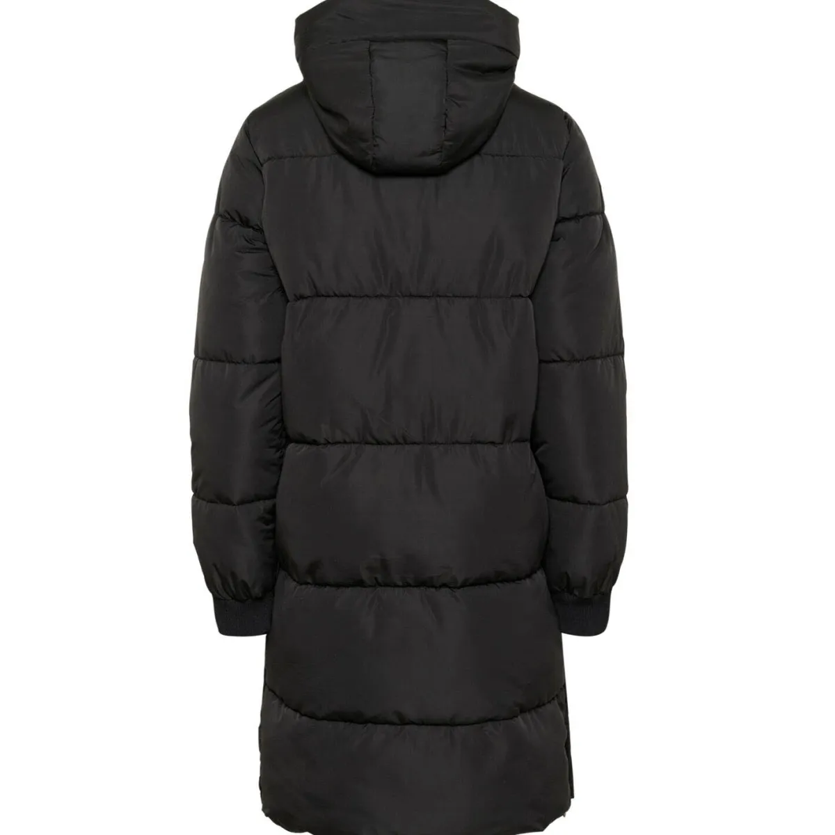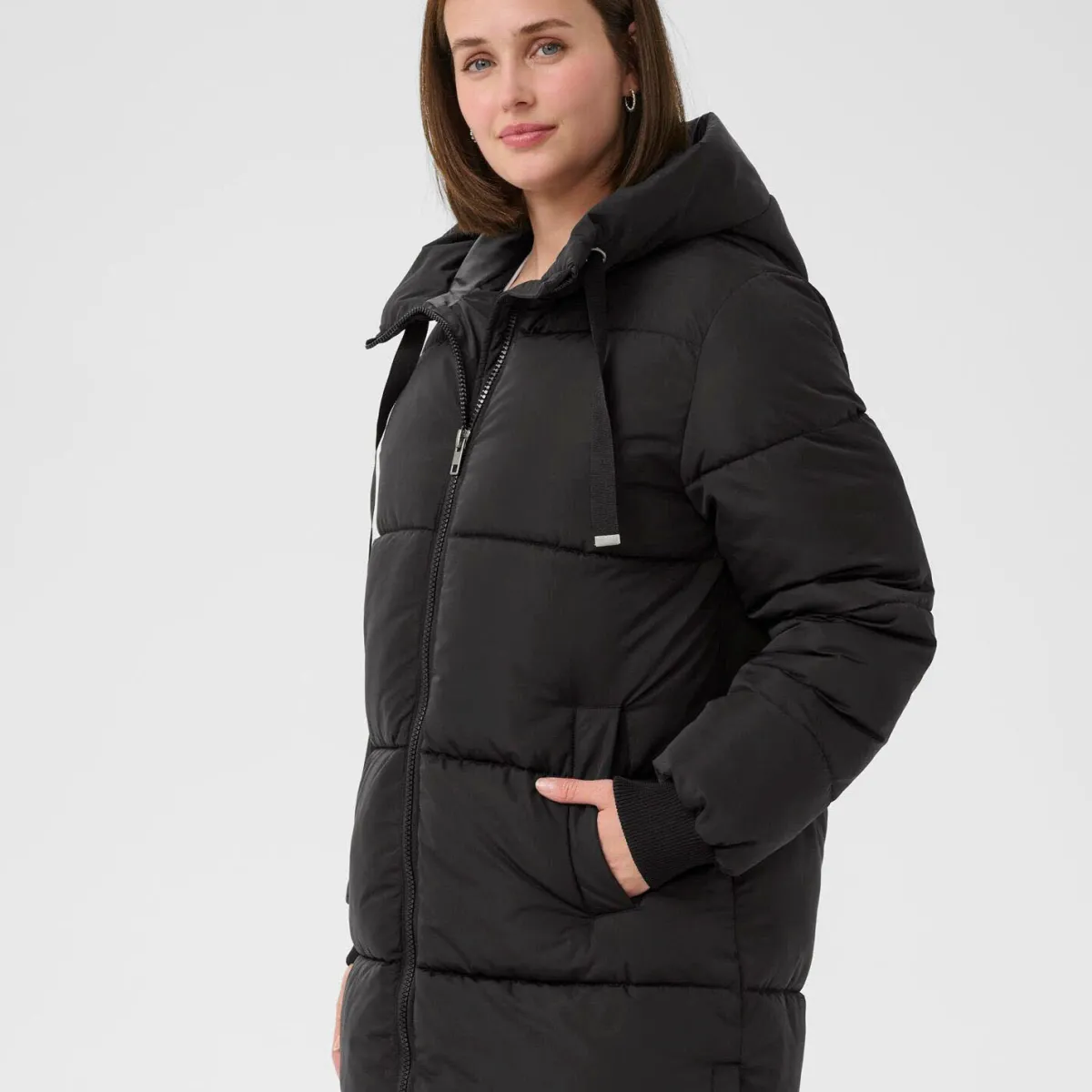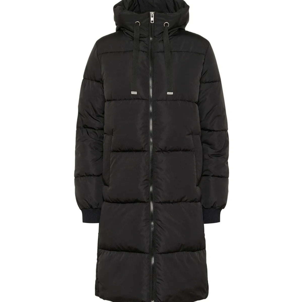 Der Steppmantel in Schwarz ist mit einer Kapuze mit Kordelzug gearbeitet. Er hat seitliche Taschen und Rippstrickbündchen am langen Ärmel. So hält er dich im Winter angenehm warm.
