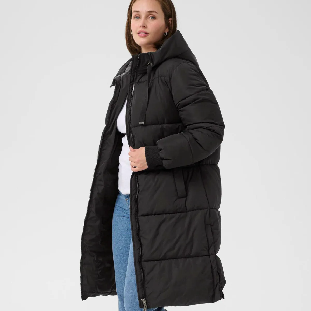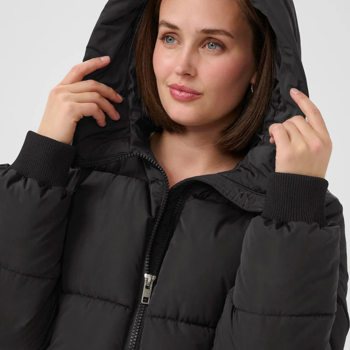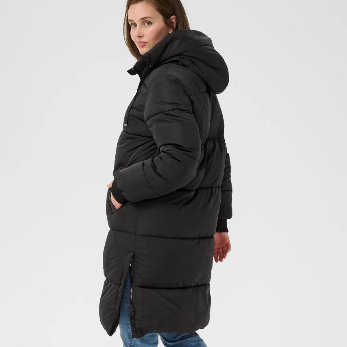 Der Steppmantel in Schwarz ist mit einer Kapuze mit Kordelzug gearbeitet. Er hat seitliche Taschen und Rippstrickbündchen am langen Ärmel. So hält er dich im Winter angenehm warm.