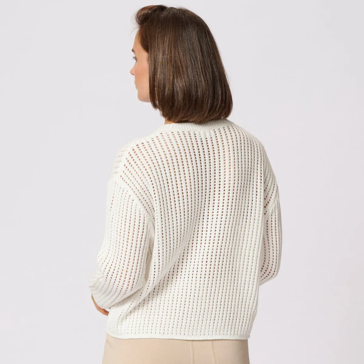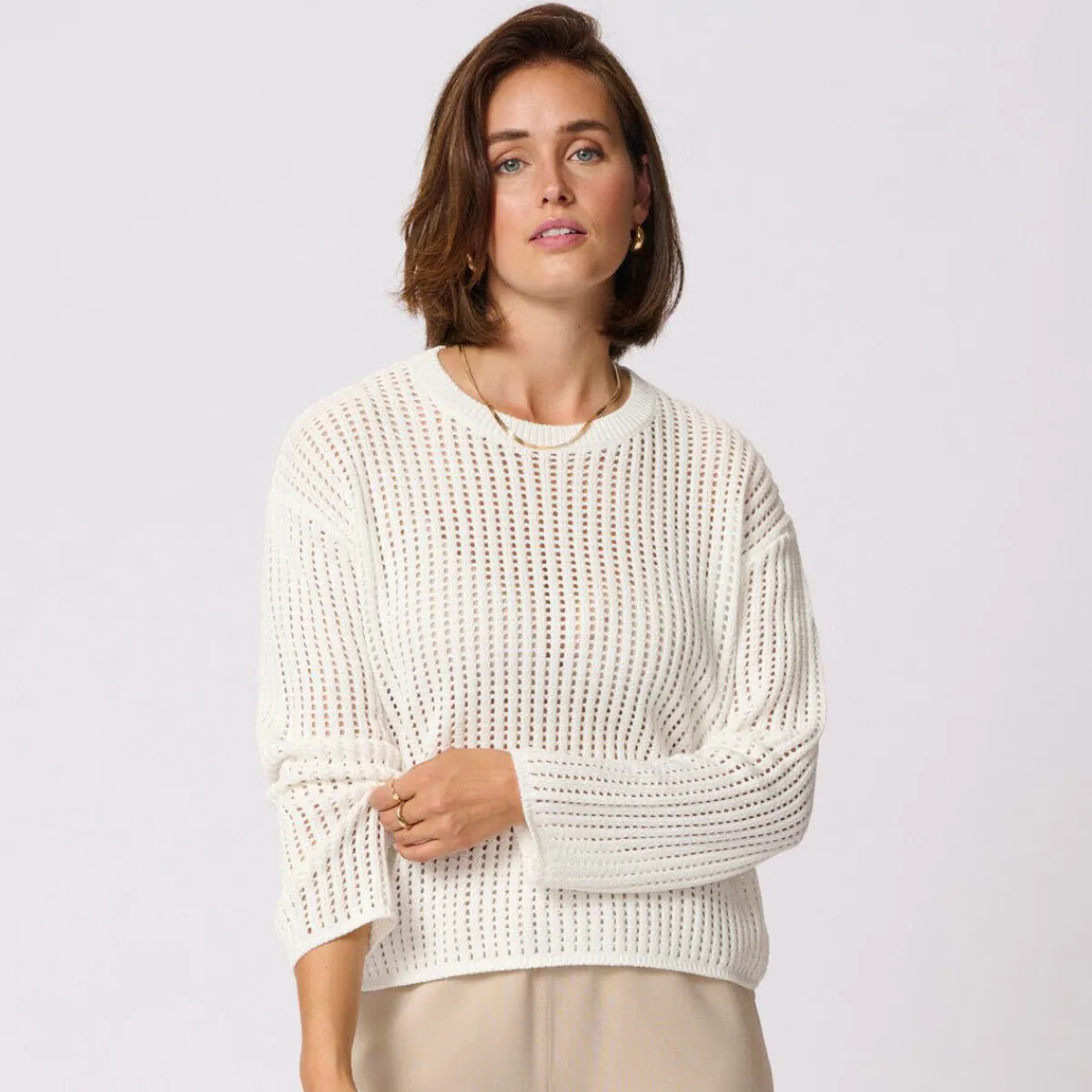 Er wurde aus einem weichen Baumwolle Mischgewebe in Weiß gefertigt und ist mit großen, luftigen Maschen gearbeitet. Er hat einen Rundhalsausschnitt und lange Ärmel.