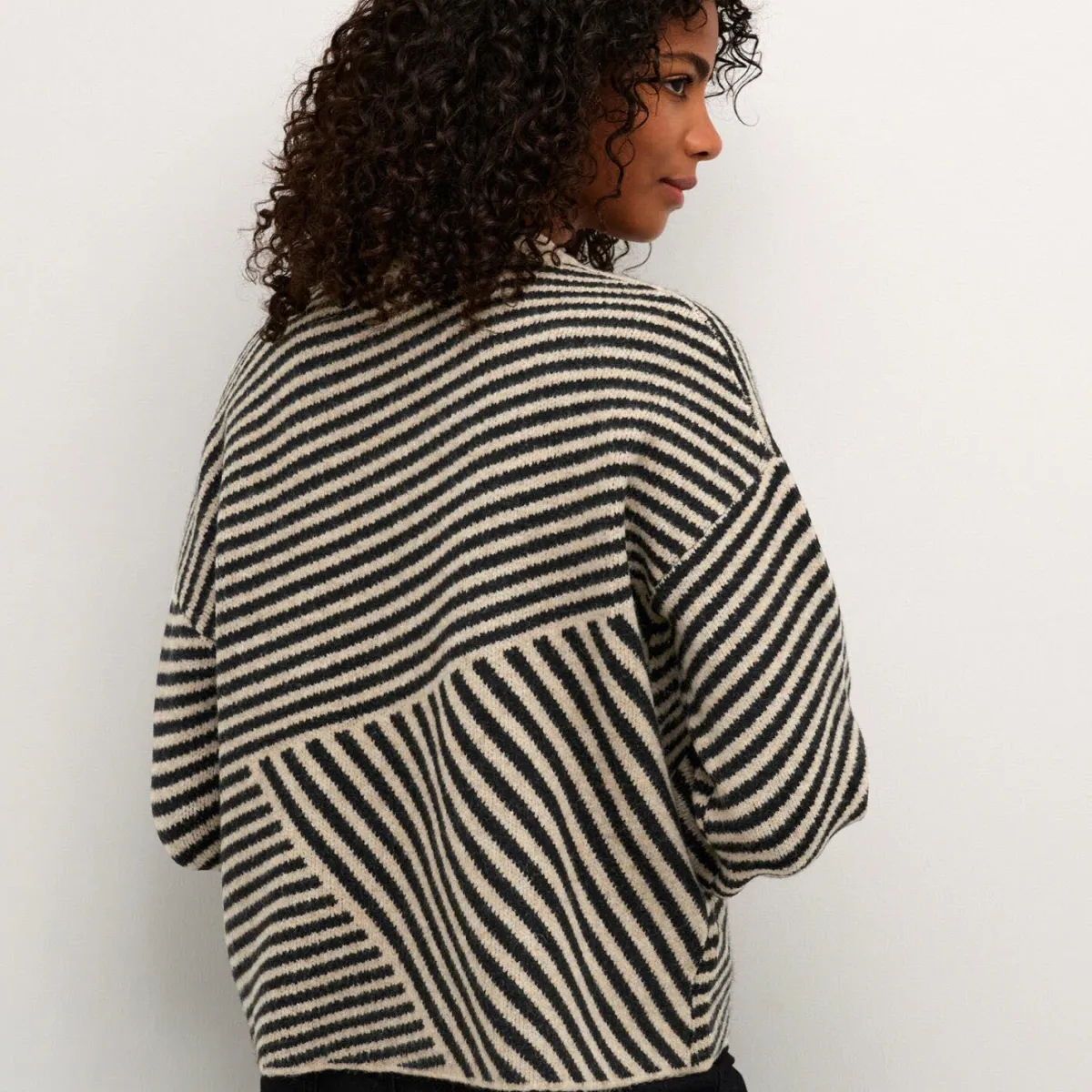 Er fällt durch sein plakatives Streifenmuster in Grau mit Schwarz sofort ins Auge. Er ist mit einem kleinen Stehkragen mit Rippstrick gearbeitet und hat lange Ärmel. Die lockere Passform macht ihn besonders komfortabel.