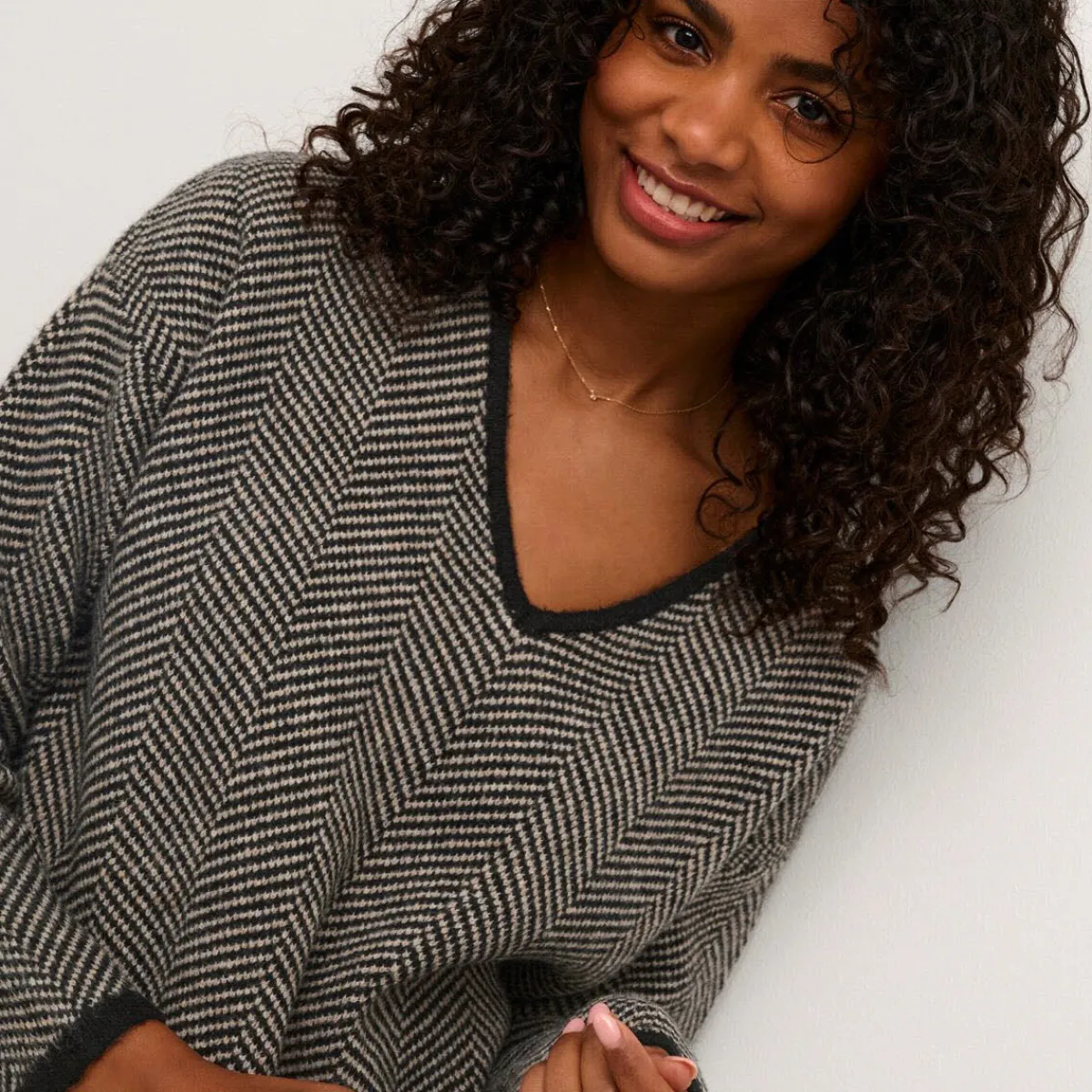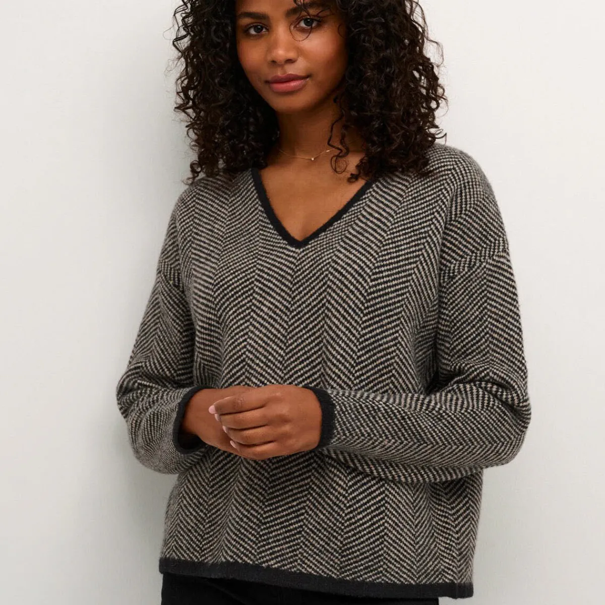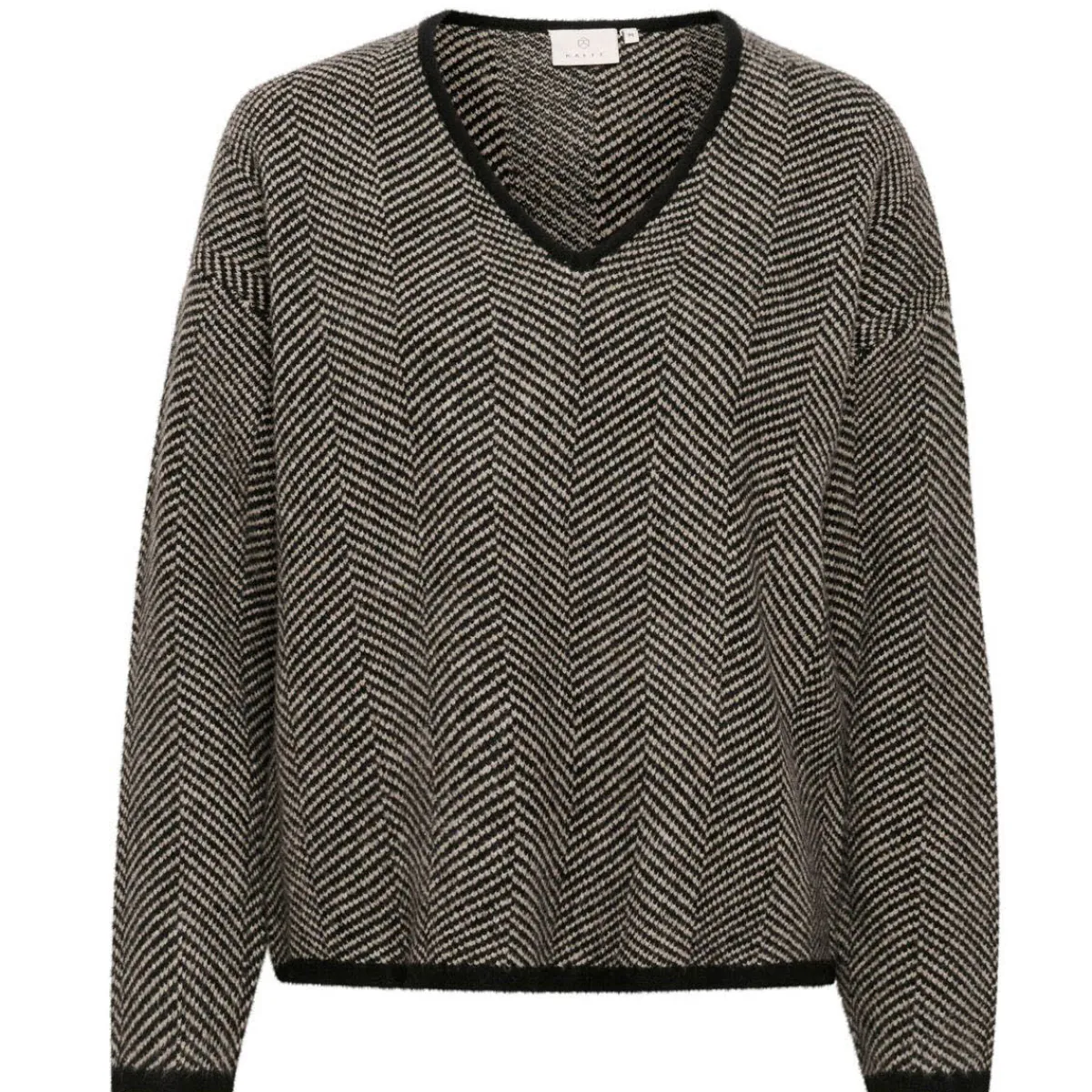Er begeistert durch seine Pfeffer und Salz Optik in Weiß und Schwarz. Der V-Ausschnitt und die Bündchen, sind Schwarz abgesetzt und verleihen ihm das gewisse Etwas.