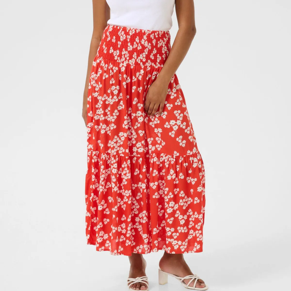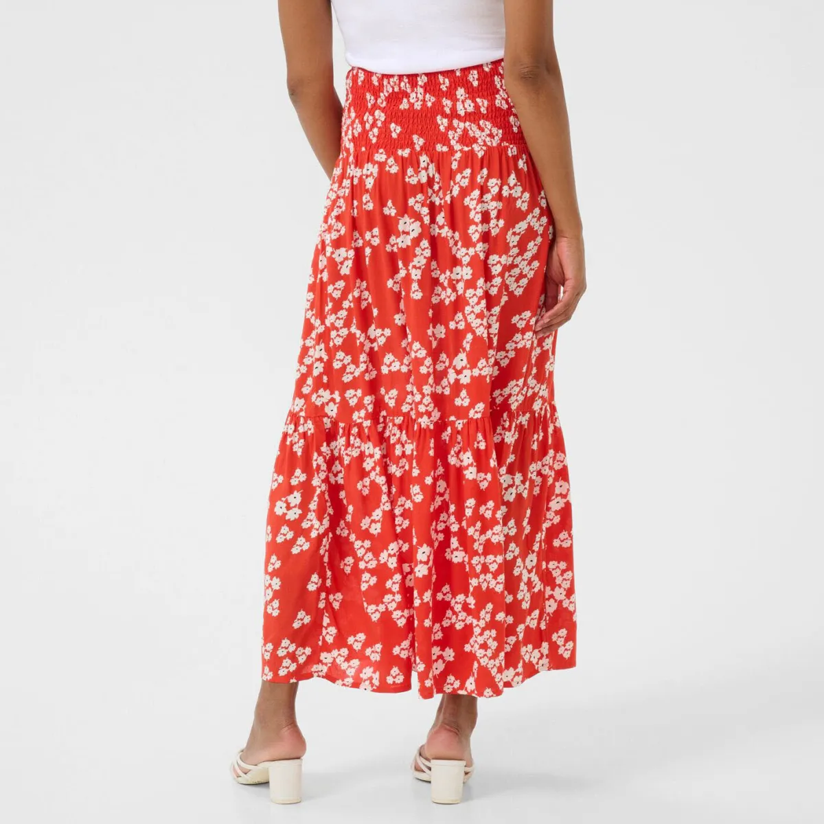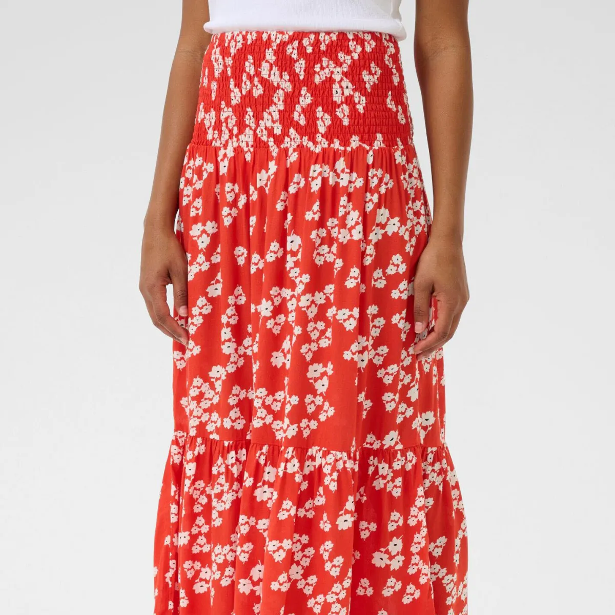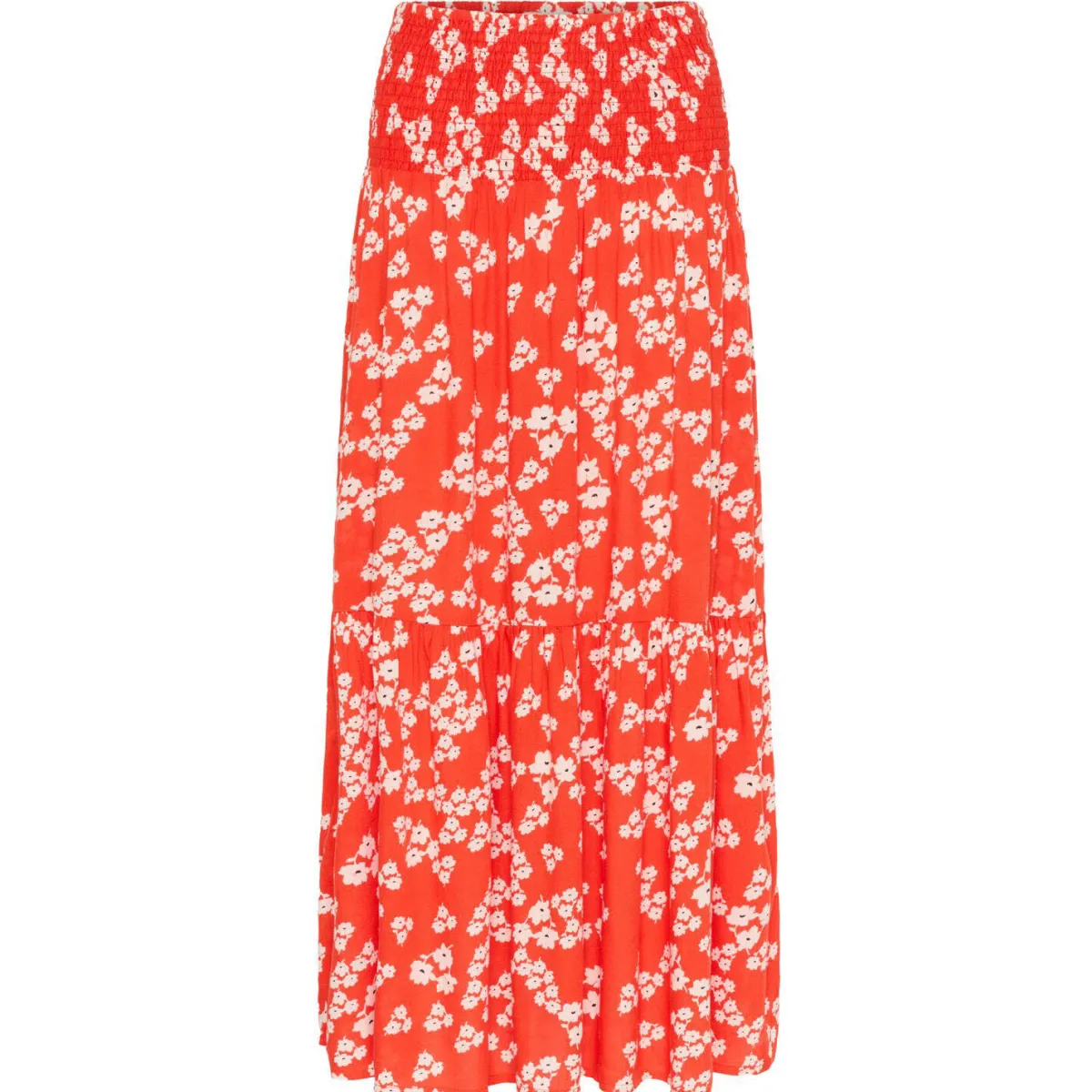 Der leichte Viskose Stoff ist mit einem Blumen Print in Rot verziert. Er hat eine elastische Taille und ist in A-Linie gearbeitet. Er ist lang geschnitten und für uns ein Must Have für den Sommer den du super kombinieren kannst.
