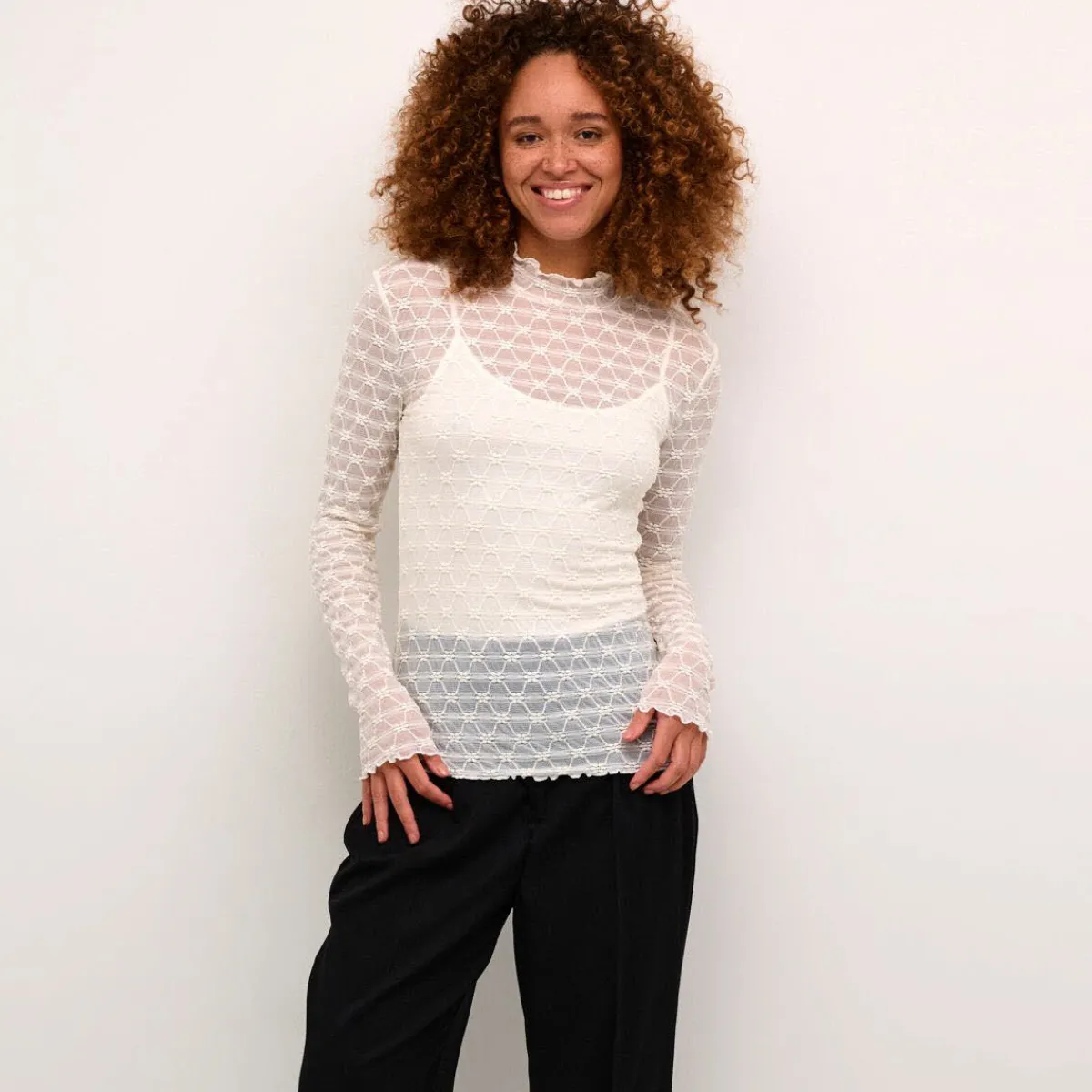 Das Highlight ist hier das Mesh Gewebe in Creme Beige, welches mit kleinen Blumen beflockt wurde. Es hat lange Ärmel und einen kleinen Stehbund am Hals.