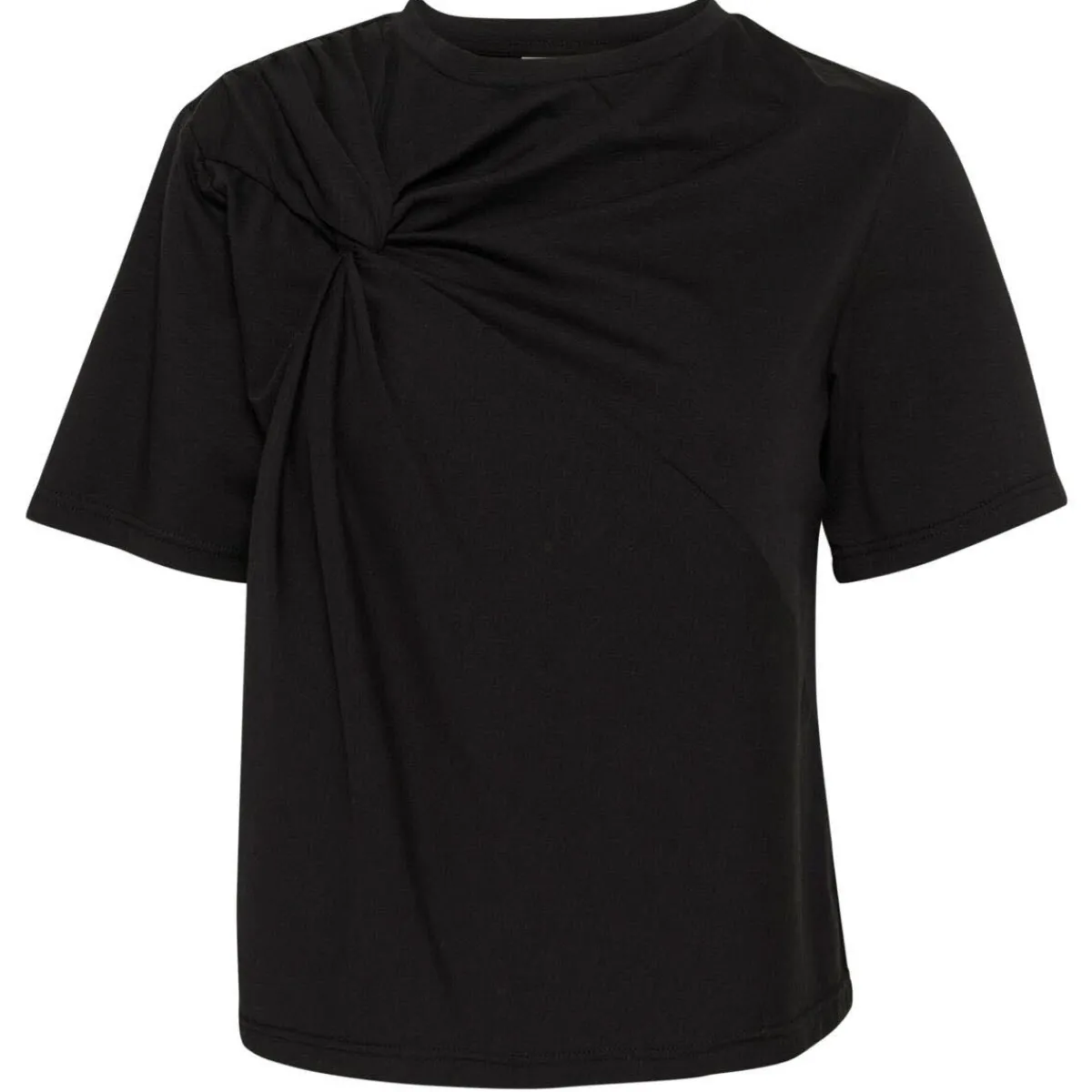 Das Shirt wurde aus einem angenehmen Mischgewebe mit Baumwolle in Schwarz gefertigt. Es ist mit einem Rundhalsausschnitt versehen und hat kurze Ärmel. Ein Hingucker ist dabei die schöne Raffung auf der Vorderseite.