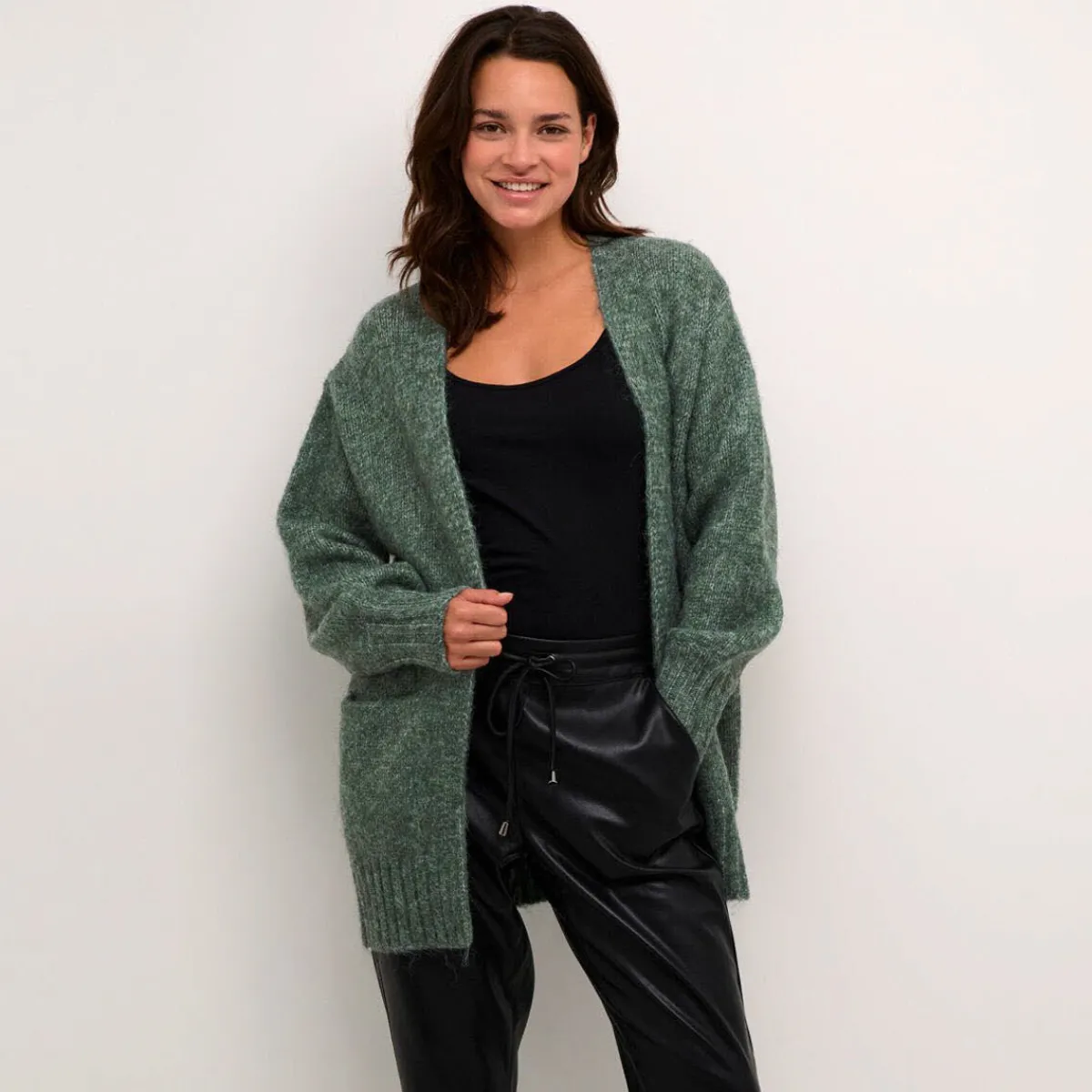 Das Strickgewebe in Grün passt super zu jedem Outfit.