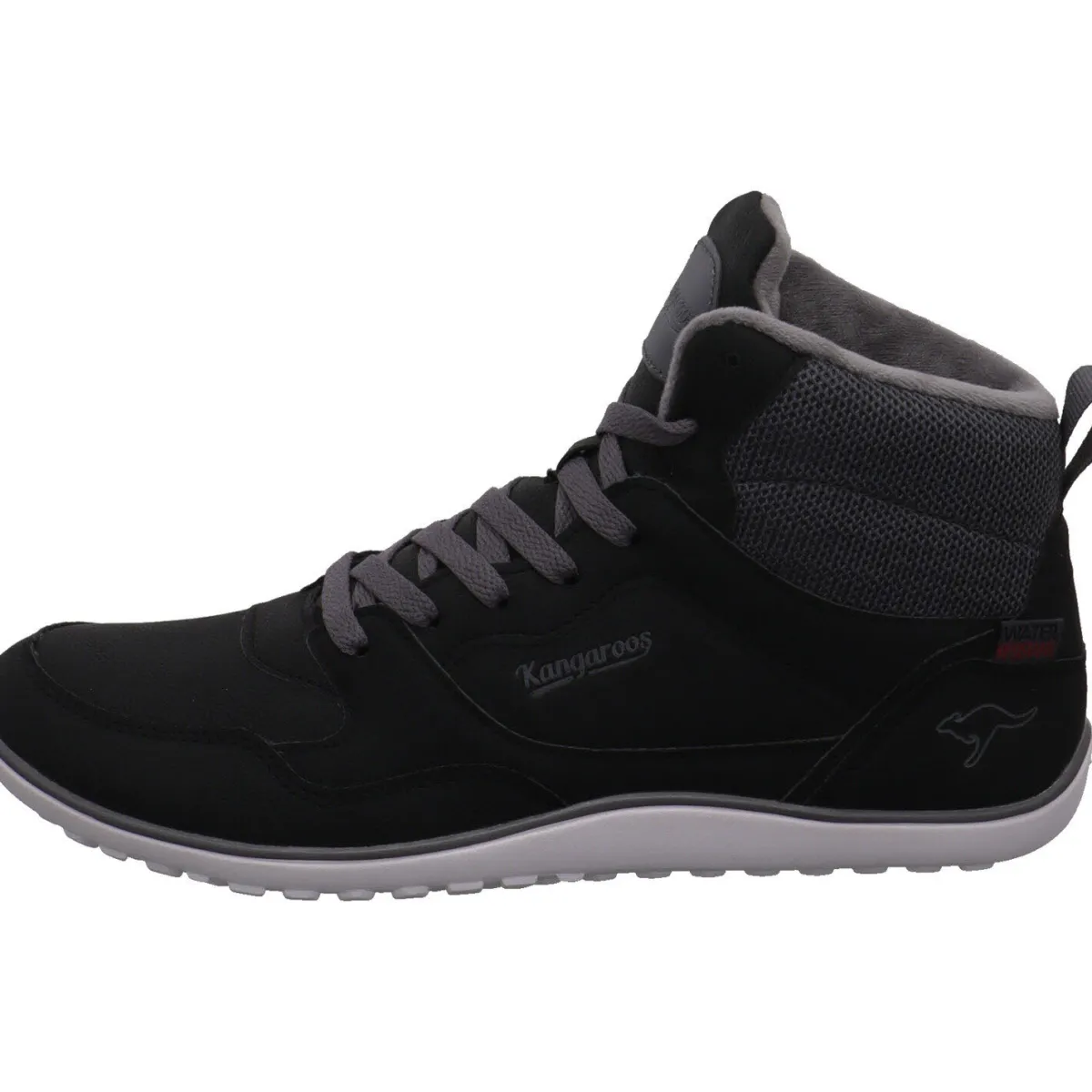 Das Barefoot Modell wurde aus Kunstleder in Schwarz und Grau gefertigt. Durch die Schnürung und der Lasche am Schaft ist der Einstieg ganz einfach.
