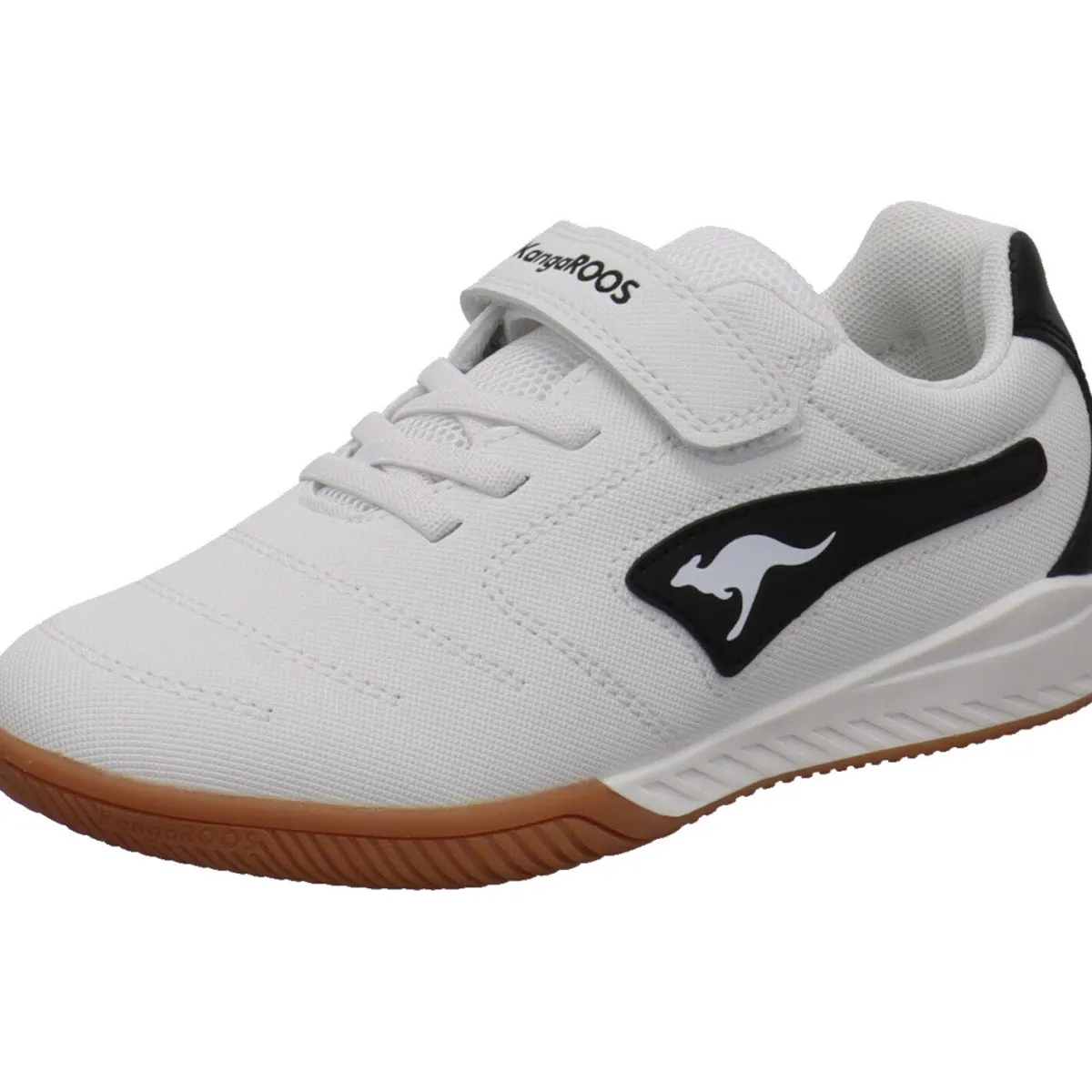 Der Kinder Hallenschuh wurde aus einem Mix aus Textil und Synthetik in Weiß gearbeitet. Die Ferse und seitliche Parts sind Schwarz abgesetzt. Durch seinen cleanen Look eignet er sich für Mädchen und Jungen. Mit der Gummischnürung und dem Klettverschluss ist das An- und Ausziehen ein Kinderspiel. Das Textil Innenfutter und der gepolsterte Schaft sorgen für ein angenehmes Tragegefühl und die Innensohle ist als Wechselfußbett gearbeitet. So kann der Schuh, nach dem Schulsport gut gelüftet werden und du kannst mit der Roos Fit Markierung die optimale Größe für dein Kind finden. Mit der hellen non marking Gummilaufsohle ist er ideal für die Sporthalle. Ob für die Schule oder den Vereinssport, ein toller Sneaker für coole Kids.