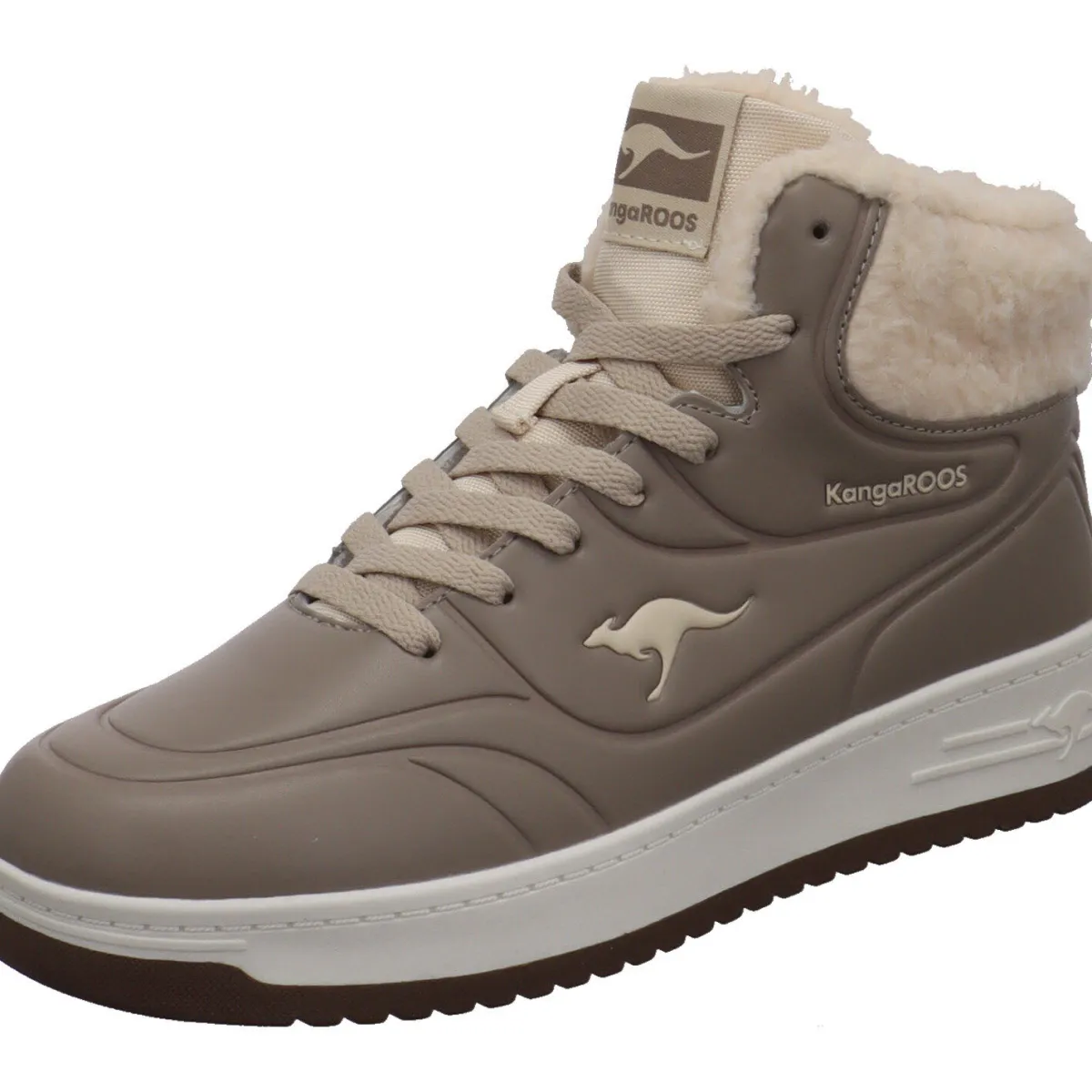 Der Schuh wurde aus pflegeleichtem Kunstleder in Beige gefertigt und besticht optisch durch die farblich abgesetzten Schnürsenkel und die typischen KangaRoos Details.