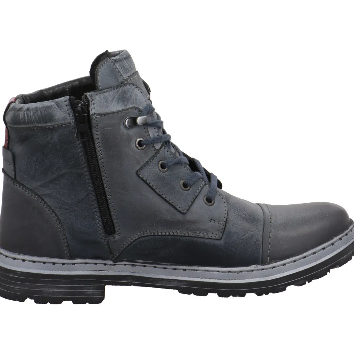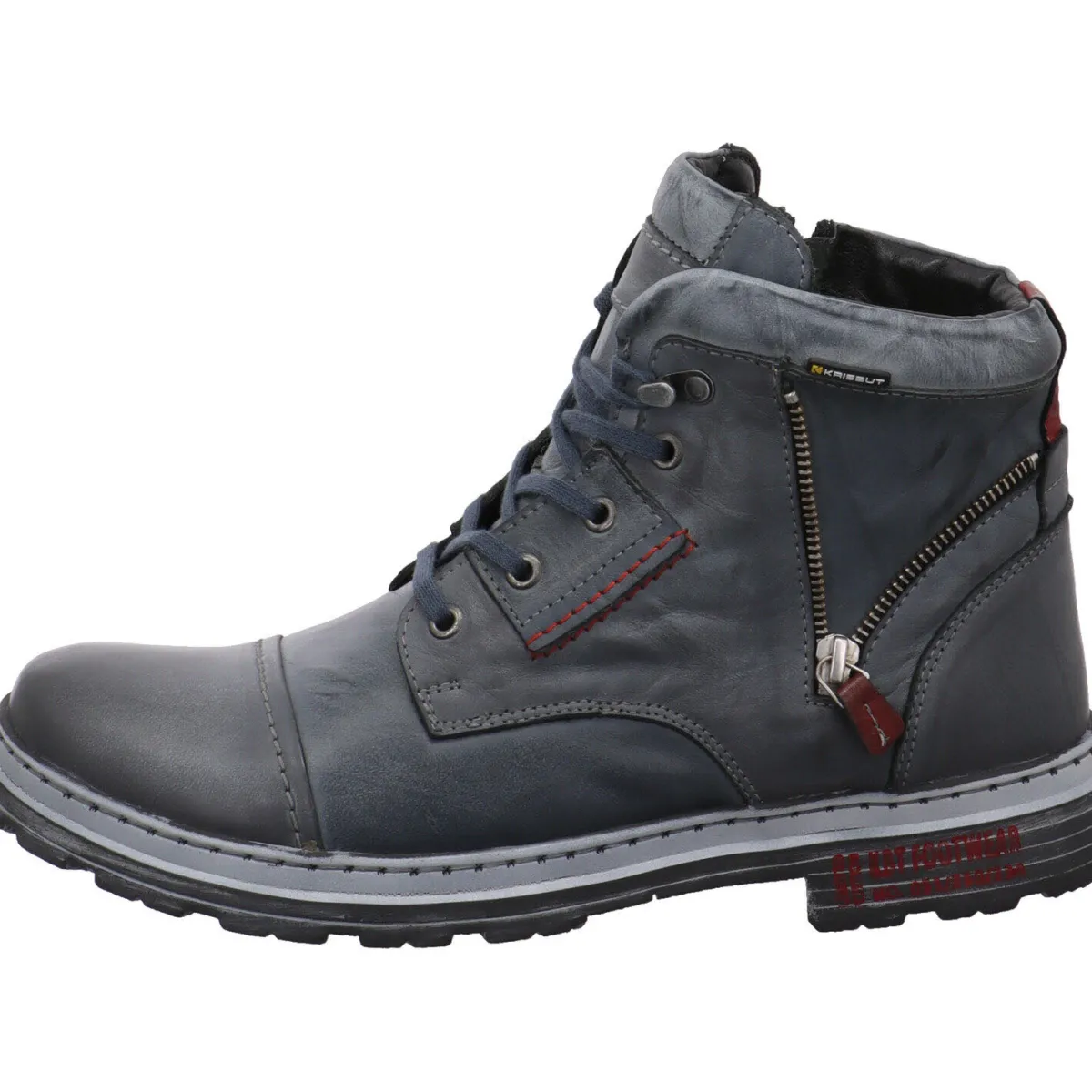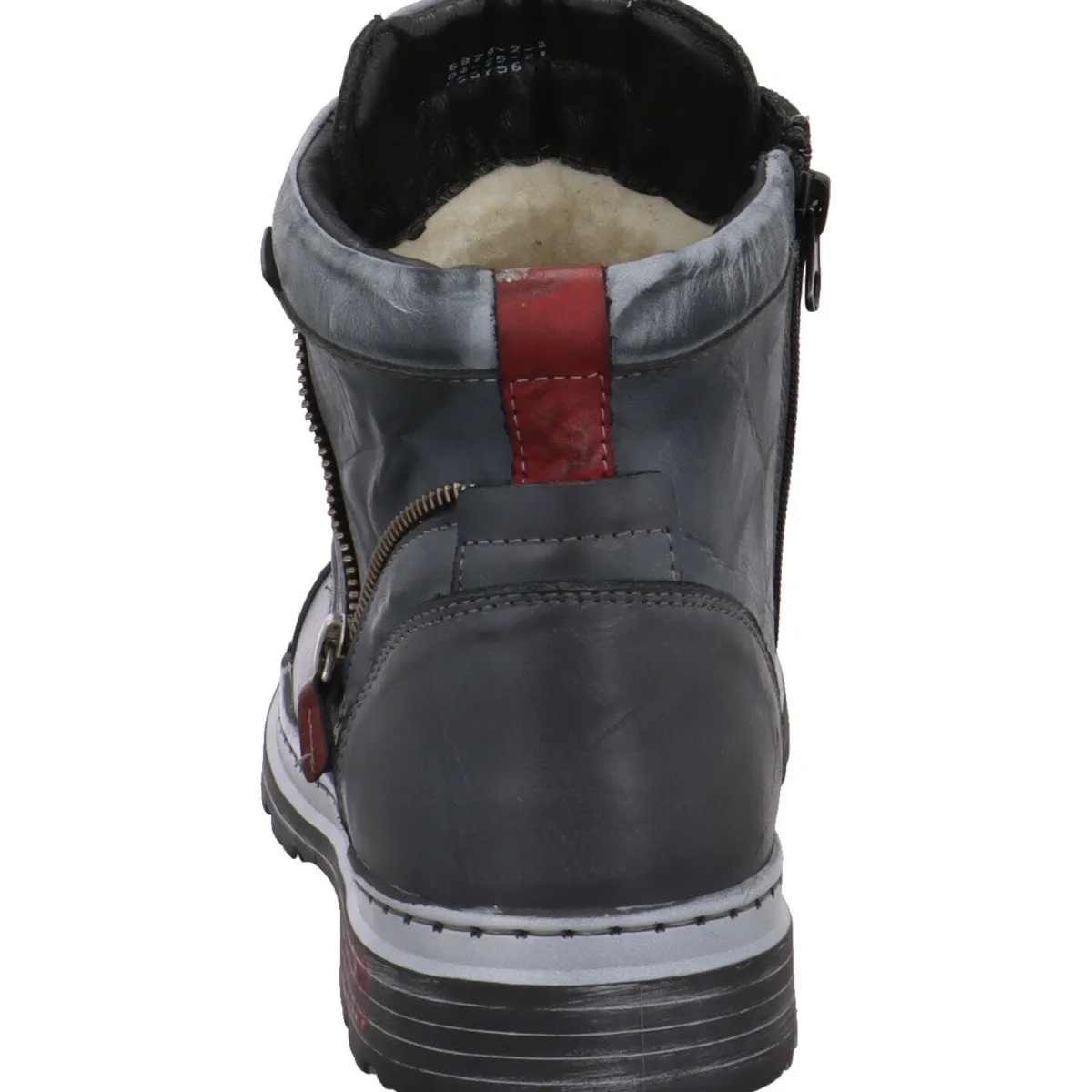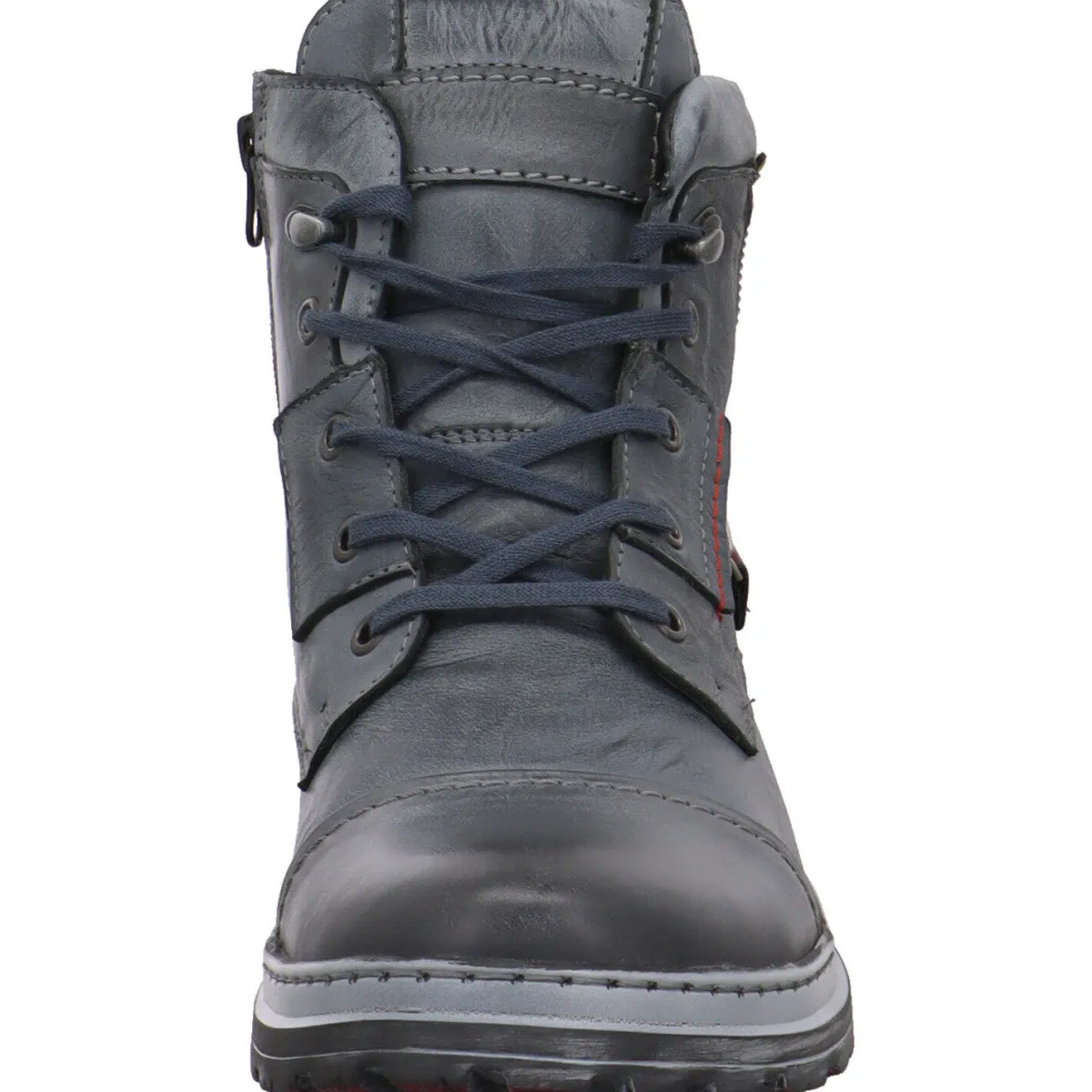 Das soft weiche Obermaterial aus Echtleder in Blau wird durch dekorative Ziernähte in Rot und Deko-Zipper optisch noch aufgewertet.