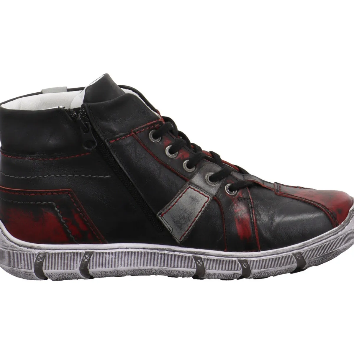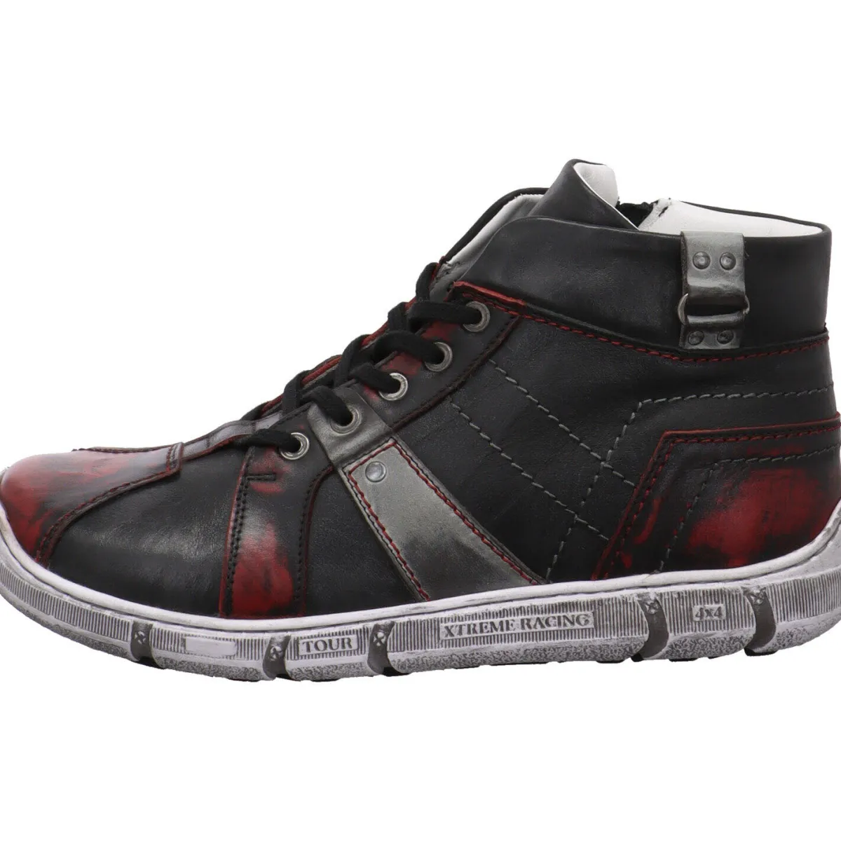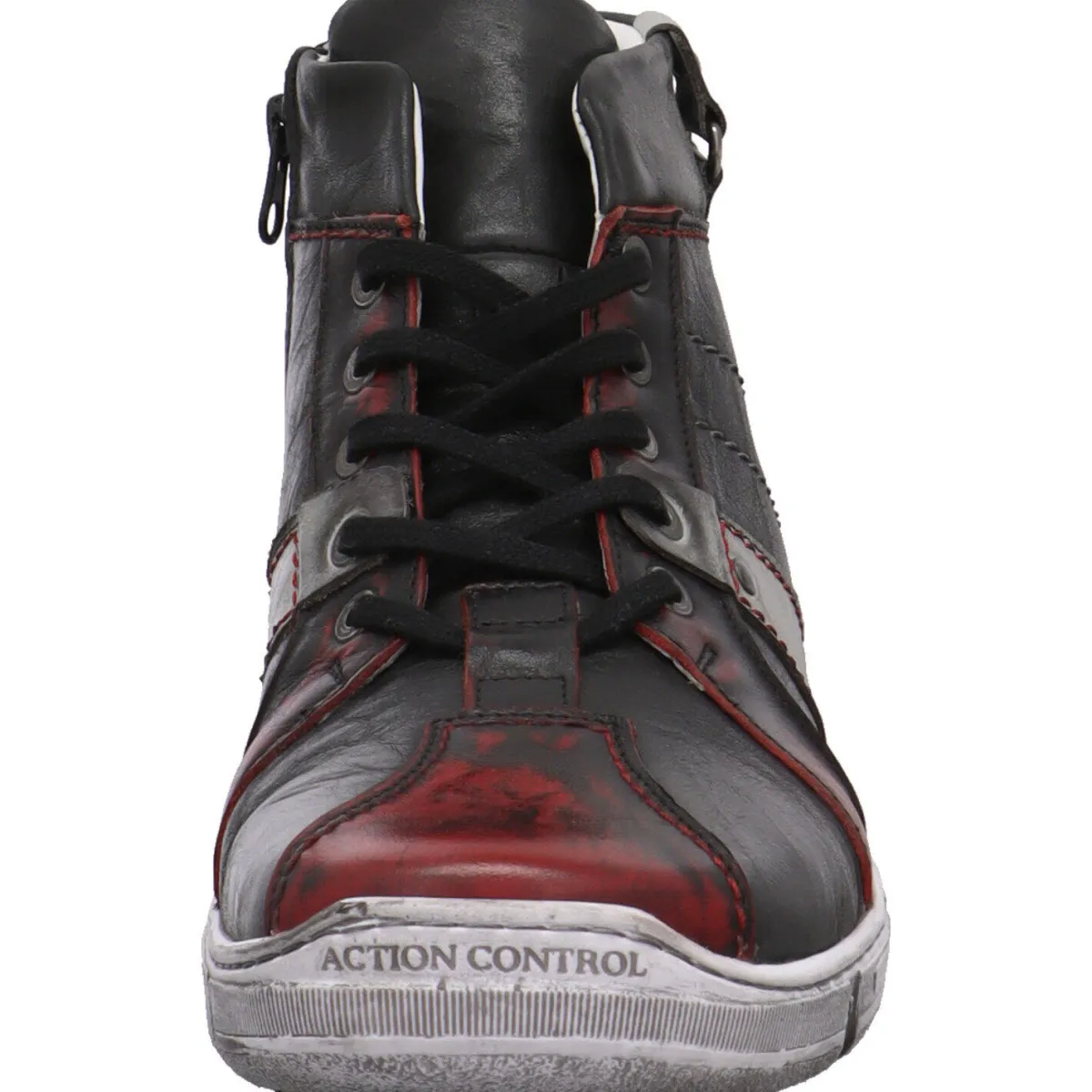 Das soft weiche Obermaterial aus Echtleder in Schwarz und Rot wird durch Parts in Grau und dekorative Ziernähte optisch noch aufgewertet.