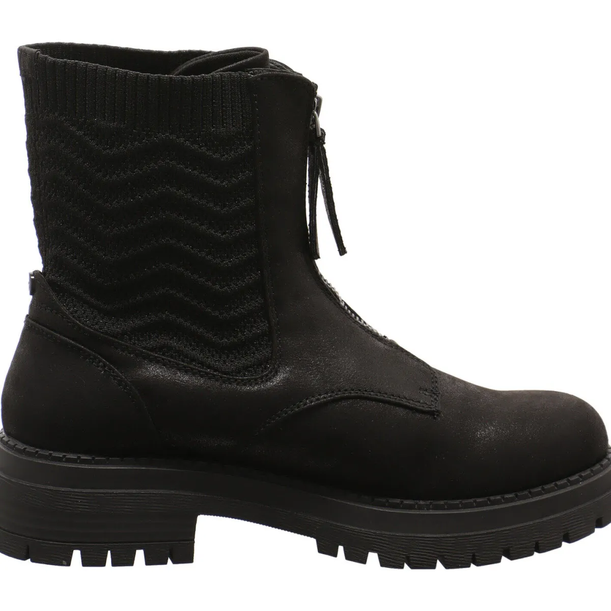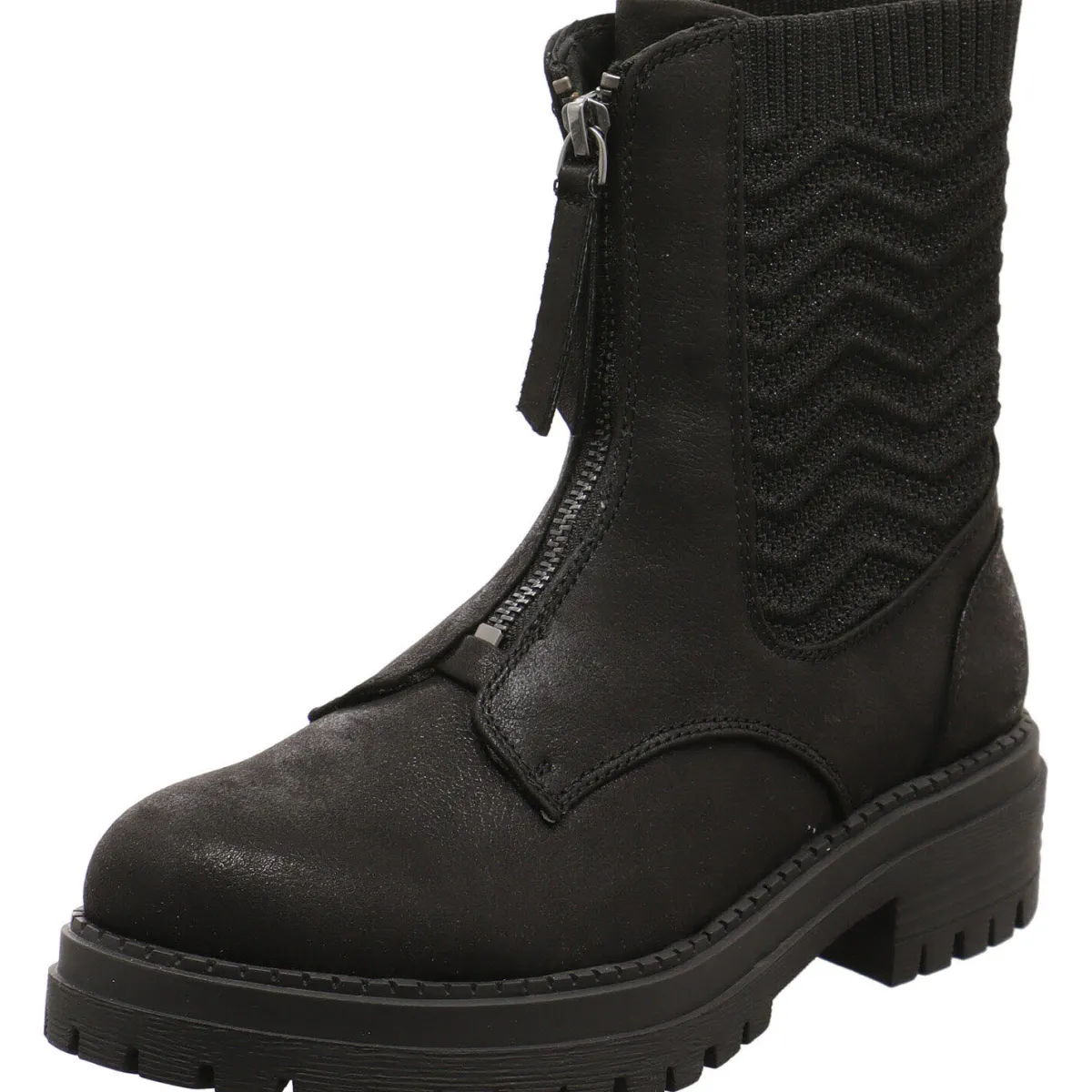 Der Boots ist rund um den Schaft mit einem elastischen textilen Einsatz, ähnlich wie einem Strumpf versehen, was den Einstieg in Kombination mit dem vorderen Reißverschluss besonders komfortabel und einfach macht.