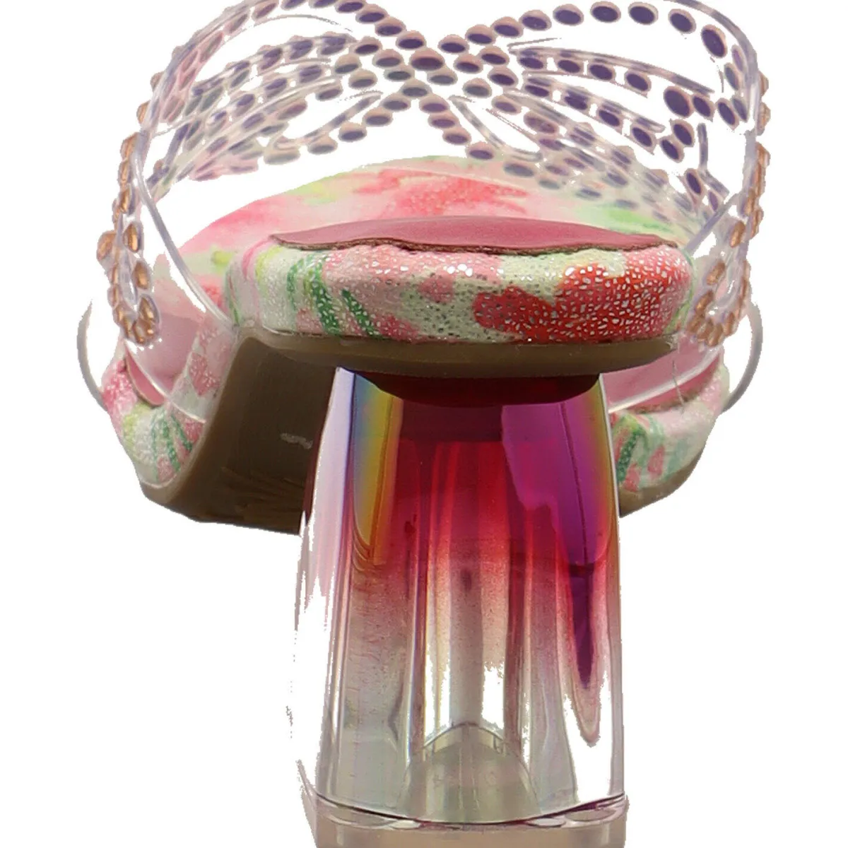 Der breite Riemen ist transparent gearbeitet und mit einem Schmetterling aus Strasssteinen verziert.