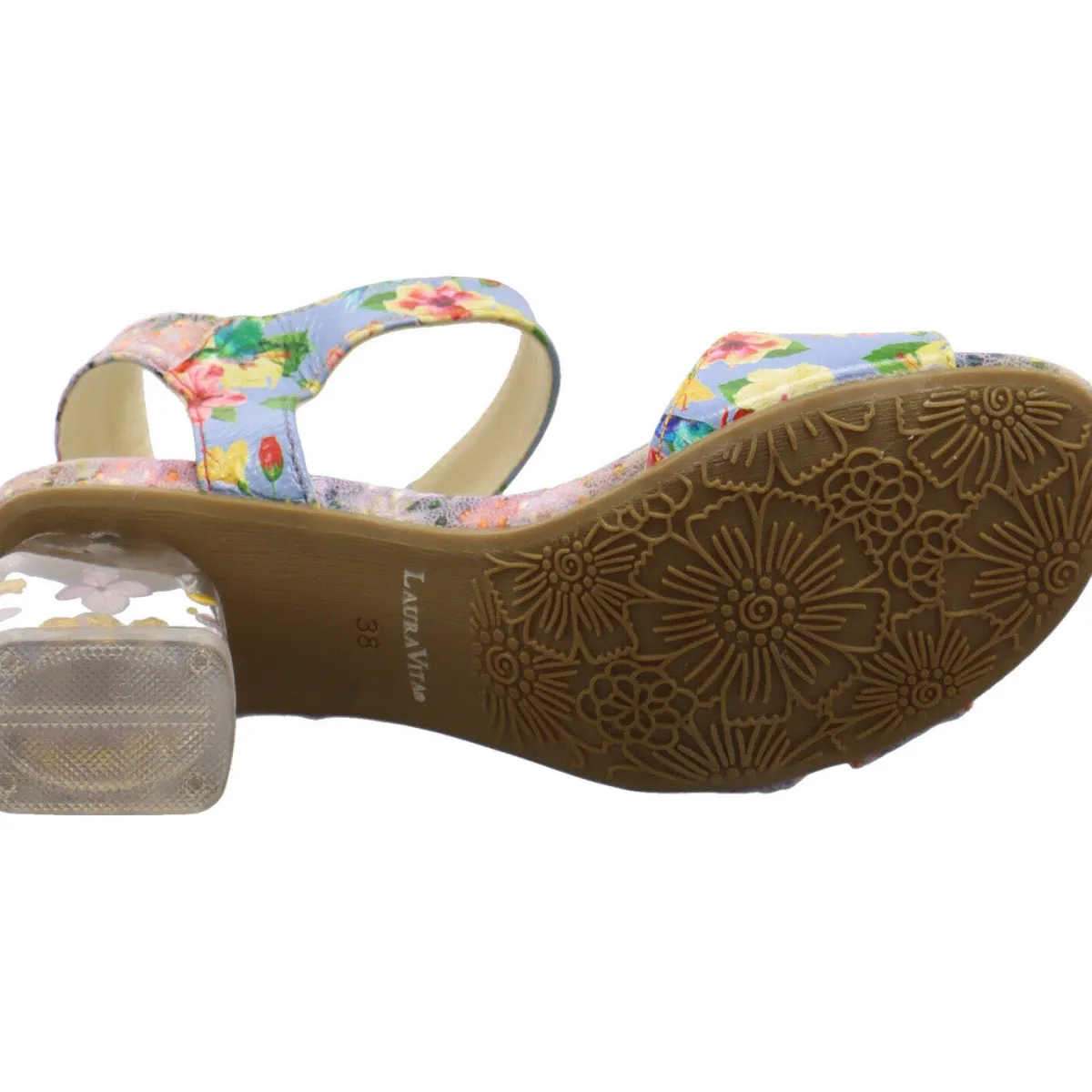 Er wurde aus einem Mix aus hochwertigem Nubukleder und genarbtem Glattleder in hellem Blau gefertigt, welches mit einem tollen floralen Muster und vielen anderen Farben versehen ist. Eine präzise aufgenähte Blume auf dem Riemen, welche zusätzlich mit einem Glitzerstein versehen wurde, ist ein tolles Highlight.