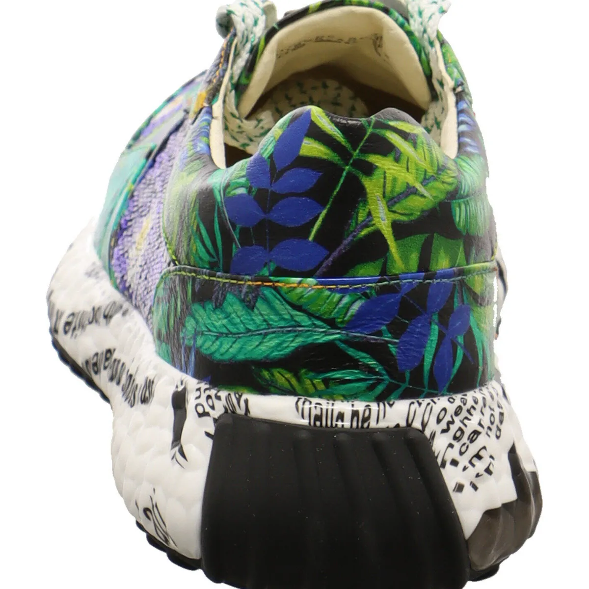 Er wurde aus einem Mix aus hochwertigem Echtleder und Paillettenbesetztem Textil in Grün gefertigt. Das Design der Blätter in Blau und Grün erstreckt sich über den gesamten Sneaker. Die Paillleten befinden sich jeweils an den Seiten und auf dem Blatt, wo sich kleine Blumen in Weiß abbilden. Das Lettering in Schwarz an der Sohle in Weiß rundet den sportlichen Look gekonnt ab. Die Schnürung in Weiß, mit Glitzerdetails in Grün sorgt für die individuelle Anpassung des Schuhs an den Fuß. Zudem ist der Sneaker durch die Echtleder Innenausstattung angenehm zu tragen und durch sein herausnehmbares Wechselfußbett überaus praktisch.
