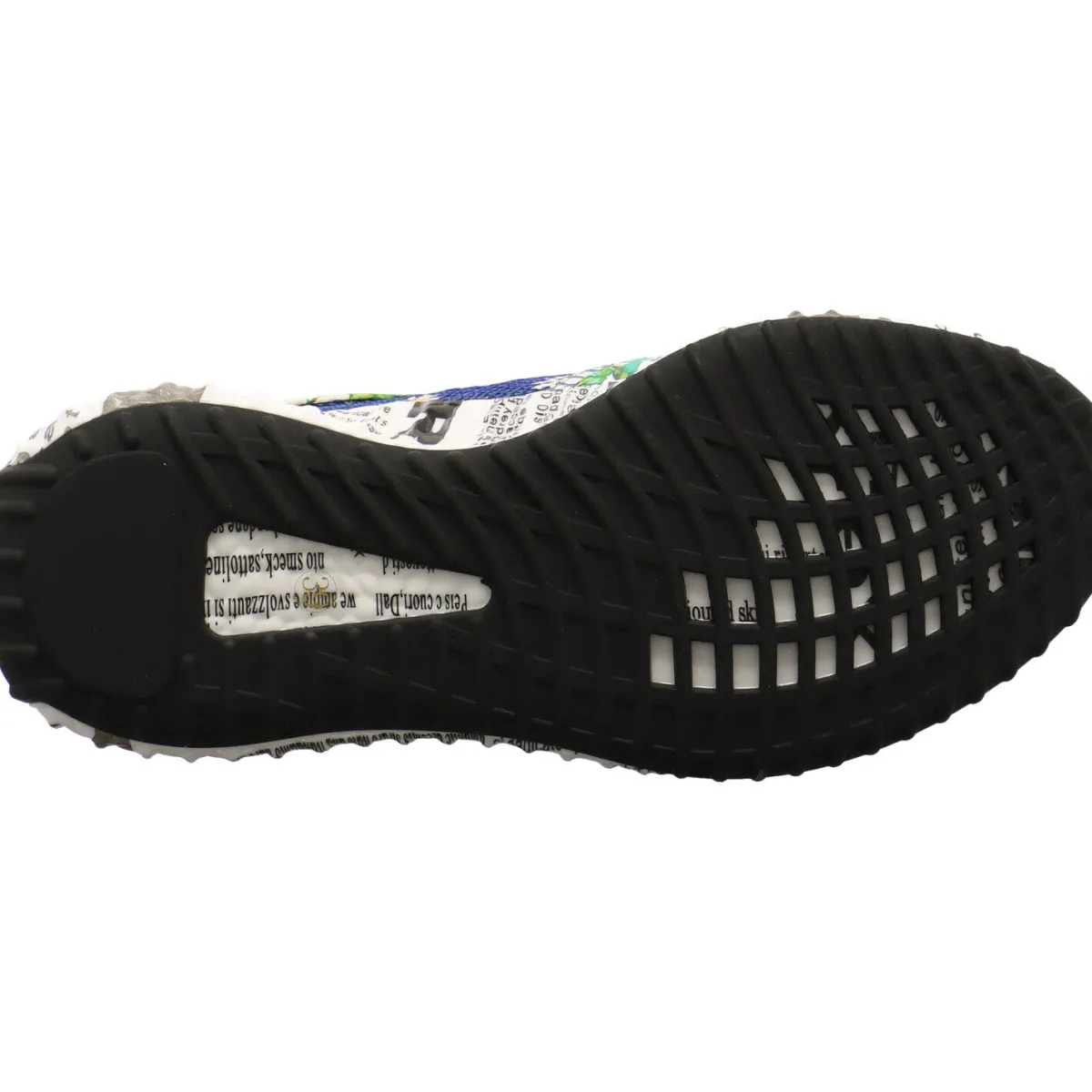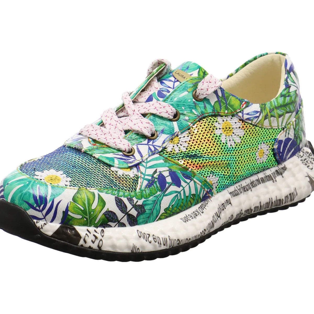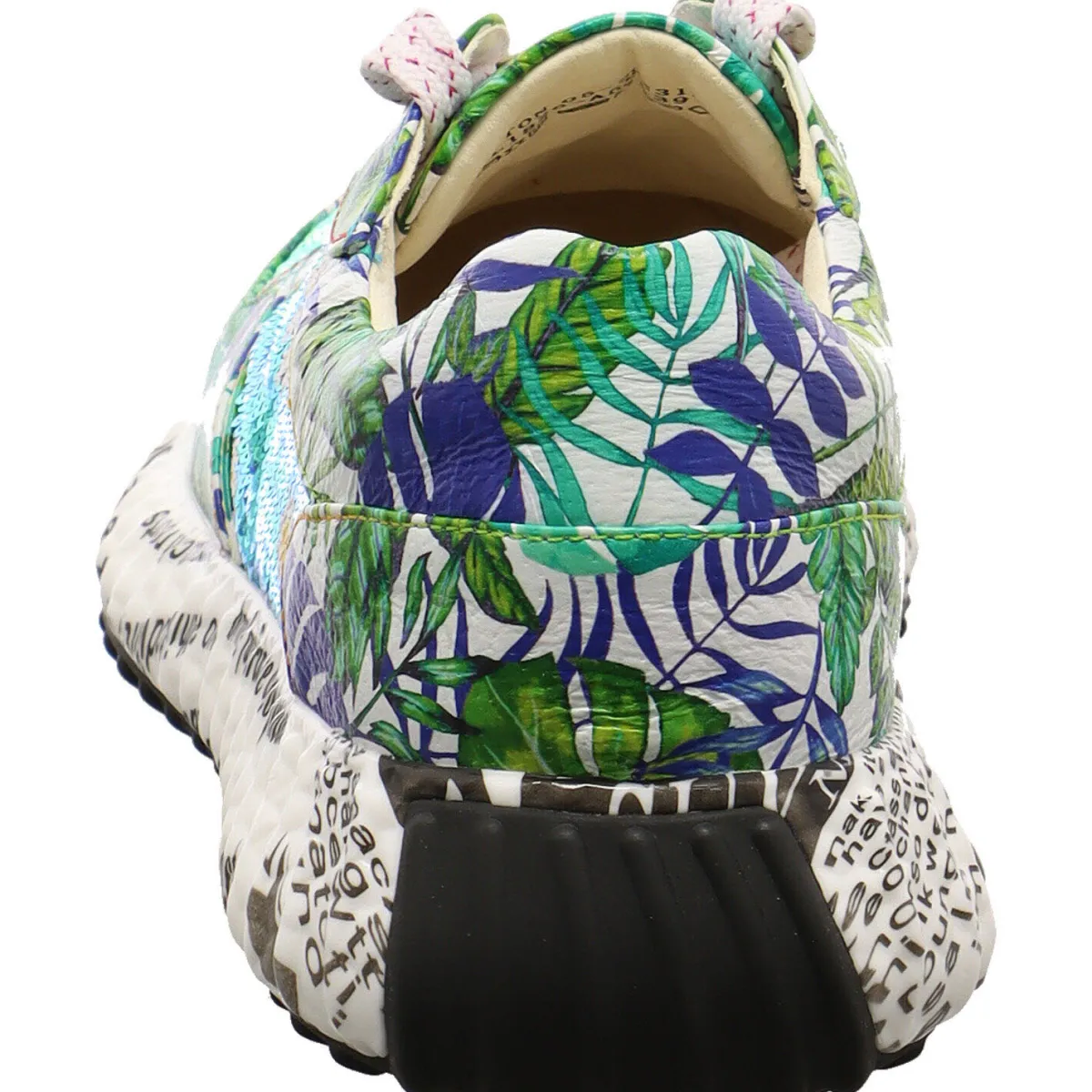 Er wurde aus einem Mix aus hochwertigem Echtleder in Weiß und Paillettenbesetztem Textil in Grün, Blau und Rosa gefertigt. Das Design der Blätter in Blau und Grün erstreckt sich über den gesamten Sneaker. Die Paillleten befinden sich jeweils an den Seiten und auf dem Blatt, wo sich kleine Blumen in Weiß abbilden. Das Lettering in Schwarz an der Sohle in Weiß rundet den sportlichen Look gekonnt ab. Die Schnürung in Weiß, mit Glitzerdetails in Pink sorgt für die individuelle Anpassung des Schuhs an den Fuß. Zudem ist der Sneaker durch die Echtleder Innenausstattung angenehm zu tragen und durch sein herausnehmbares Wechselfußbett überaus praktisch.