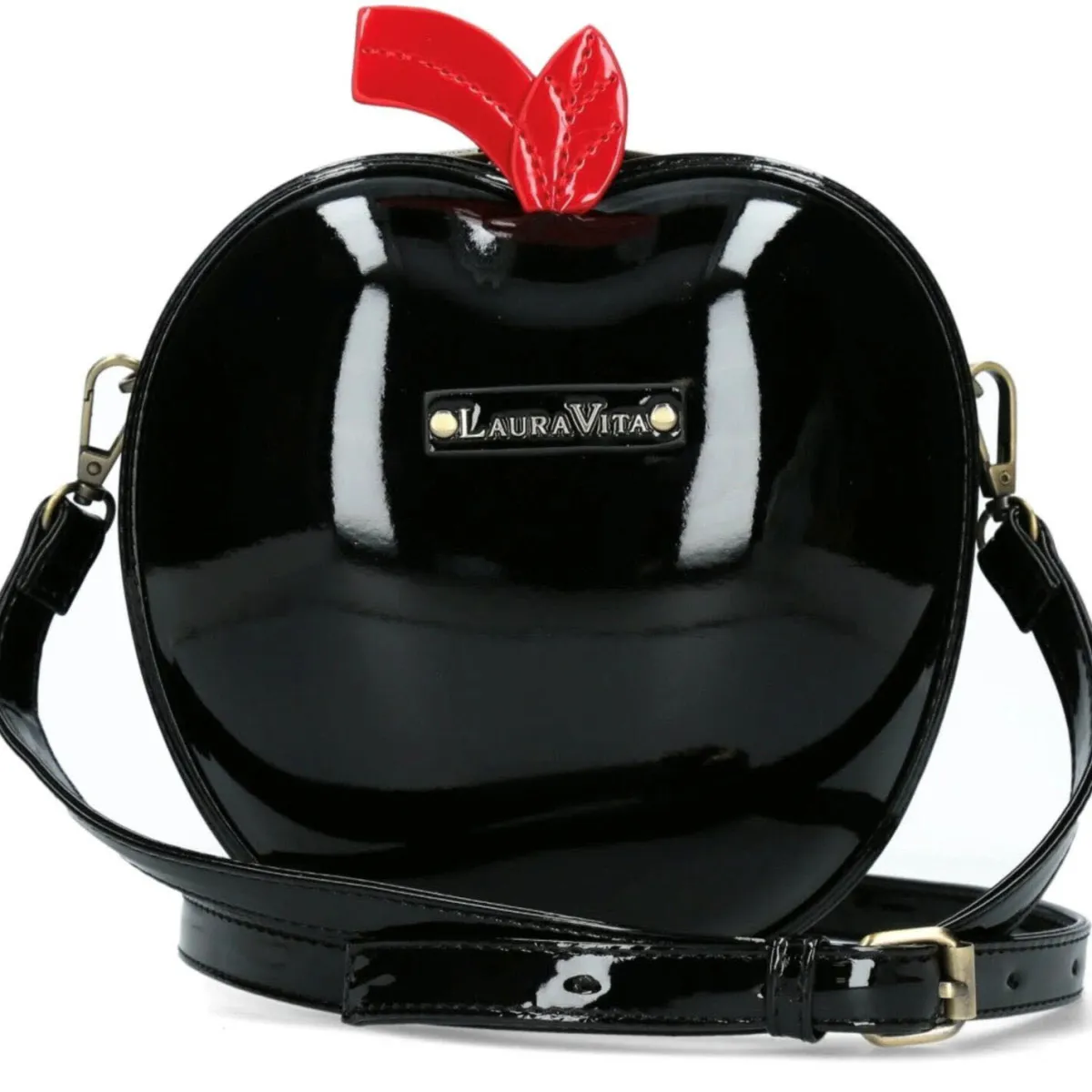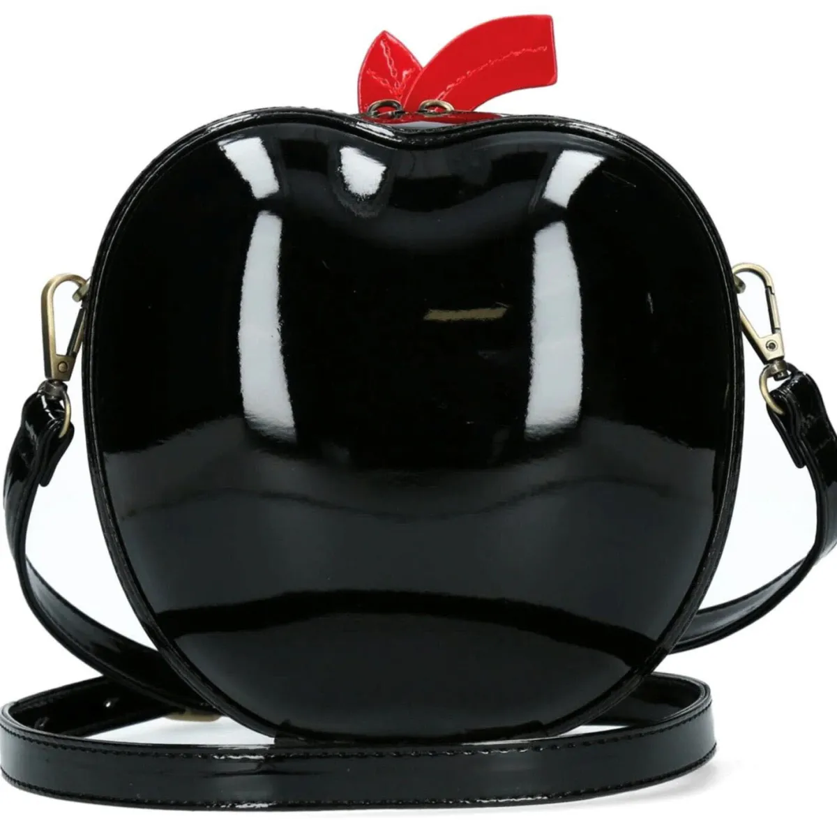 Sie wurde in Form eines Apfel gearbeitet und ist Lack Schwarz mit Rot. Du kannst sie mit einem Reißverschluß öffnen. Innen findest du ein schönes Blumen Muster. Sie bietet Platz für die Kleinigkeiten auf die du nicht verzichten möchtest. Am Taschenboden sind vier Metall Nieten in Gold angebracht, dadurch hat sie einen optimalen Stand. Mit dem verstellbaren Umhängegurt kannst du sie bequem Crossover tragen.