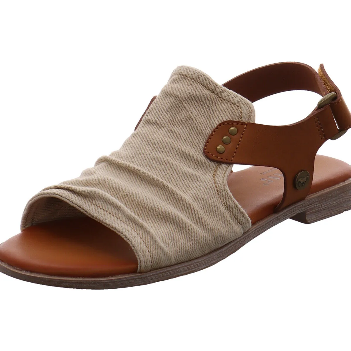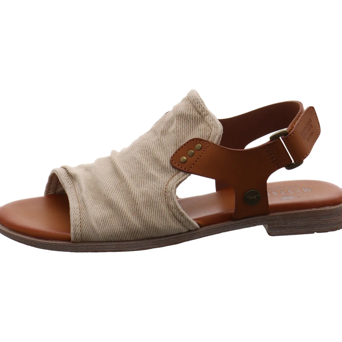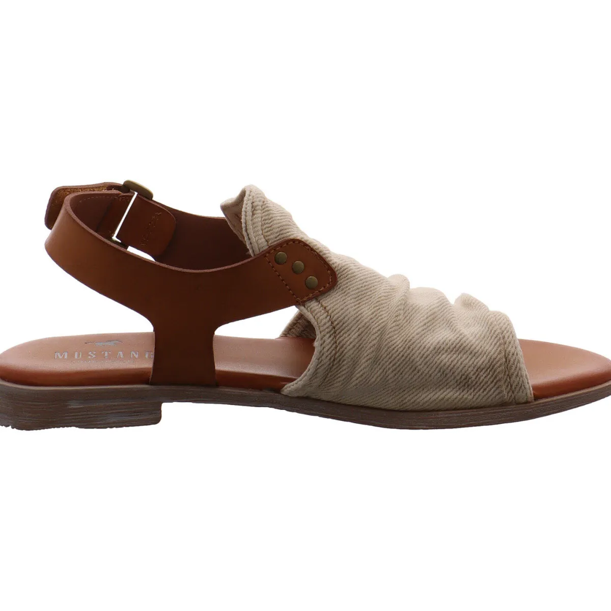 Gefertigt aus einem Mix aus Textil und Kunstleder, fällt sofort der breite Riemen in Jeans Beige ins Auge. Dieser ist mit dem Riemen in Cognac Braun verbunden und ergibt zusammen eine tolle Farbkombination. Weitere tolle Details, sind die Nieten und die Schnalle in Alt Gold und die Niete mit dem Mustang Logo an der Seite.