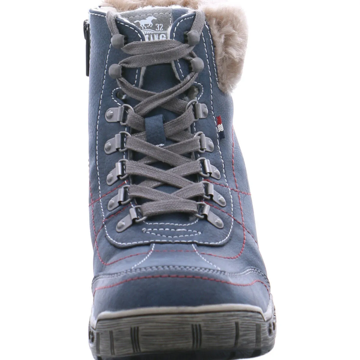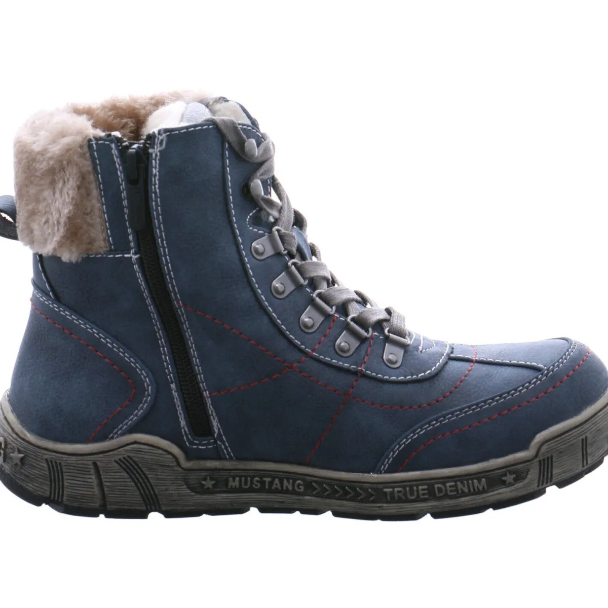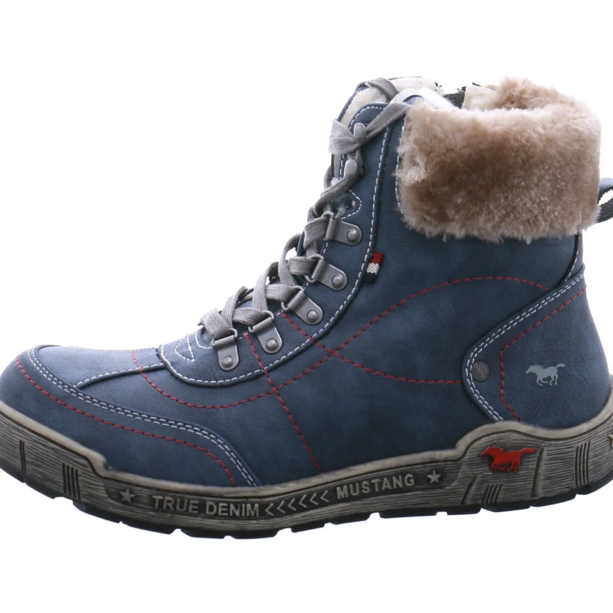 Authentisch genarbtes Obermaterial aus Kunstleder in Blau wird mit kontrastfarbenen Schnürsenkeln und Ziernähten in Rot kombiniert und gibt dem Schuh das gewisse Etwas.