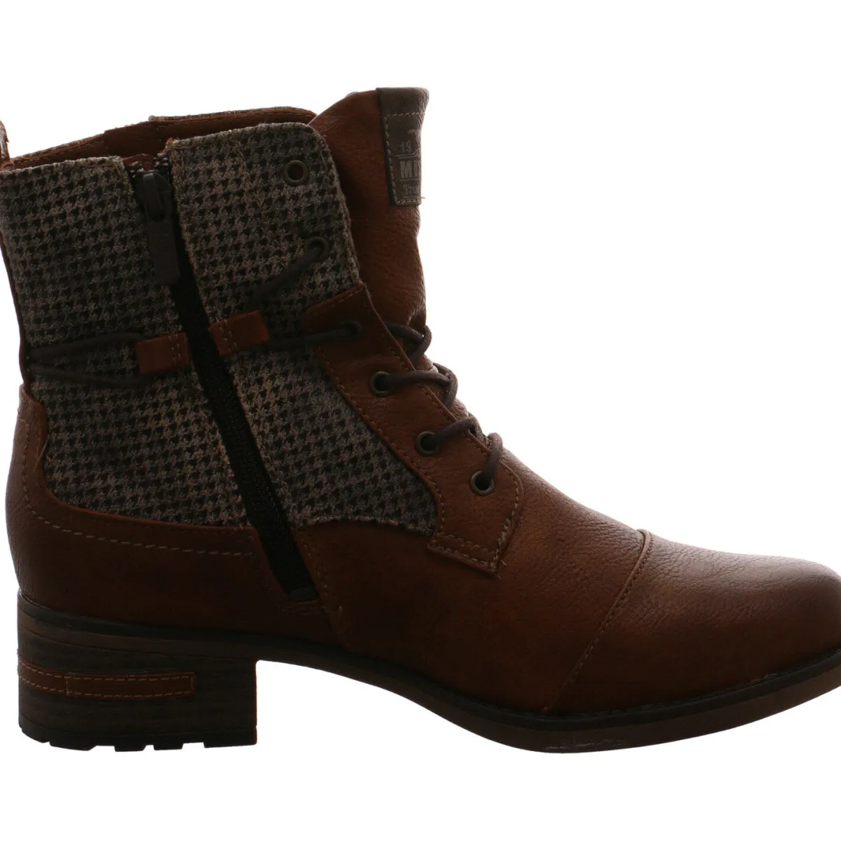 Gefertigt aus authentisch genarbtem Kunstleder in Braun besticht sie durch den farblich abgesetzten Einsatz in Grau mit Hahnentritt Muster. Der Blockabsatz ist mit einem Einsatz mit dem Marken Logo versehen und rundet das Design gekonnt ab.