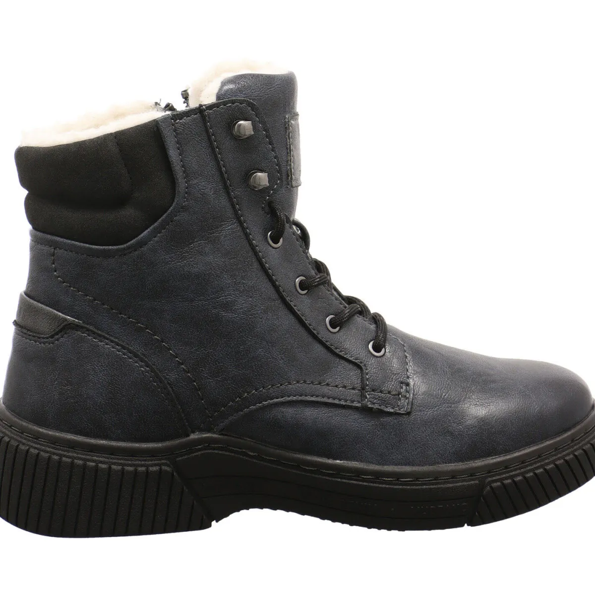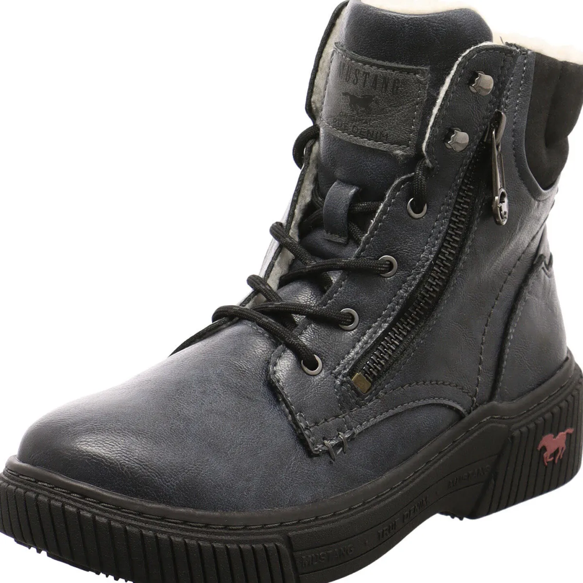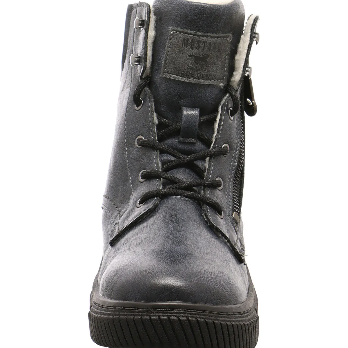 Authentisch genarbtes Obermaterial aus Kunstleder in Blau, wird mit kontrastfarbenen Schnürsenkeln und einem Textil Einsatz am Schaft in Schwarz kombiniert und gibt dem Schuh das gewisse Etwas.