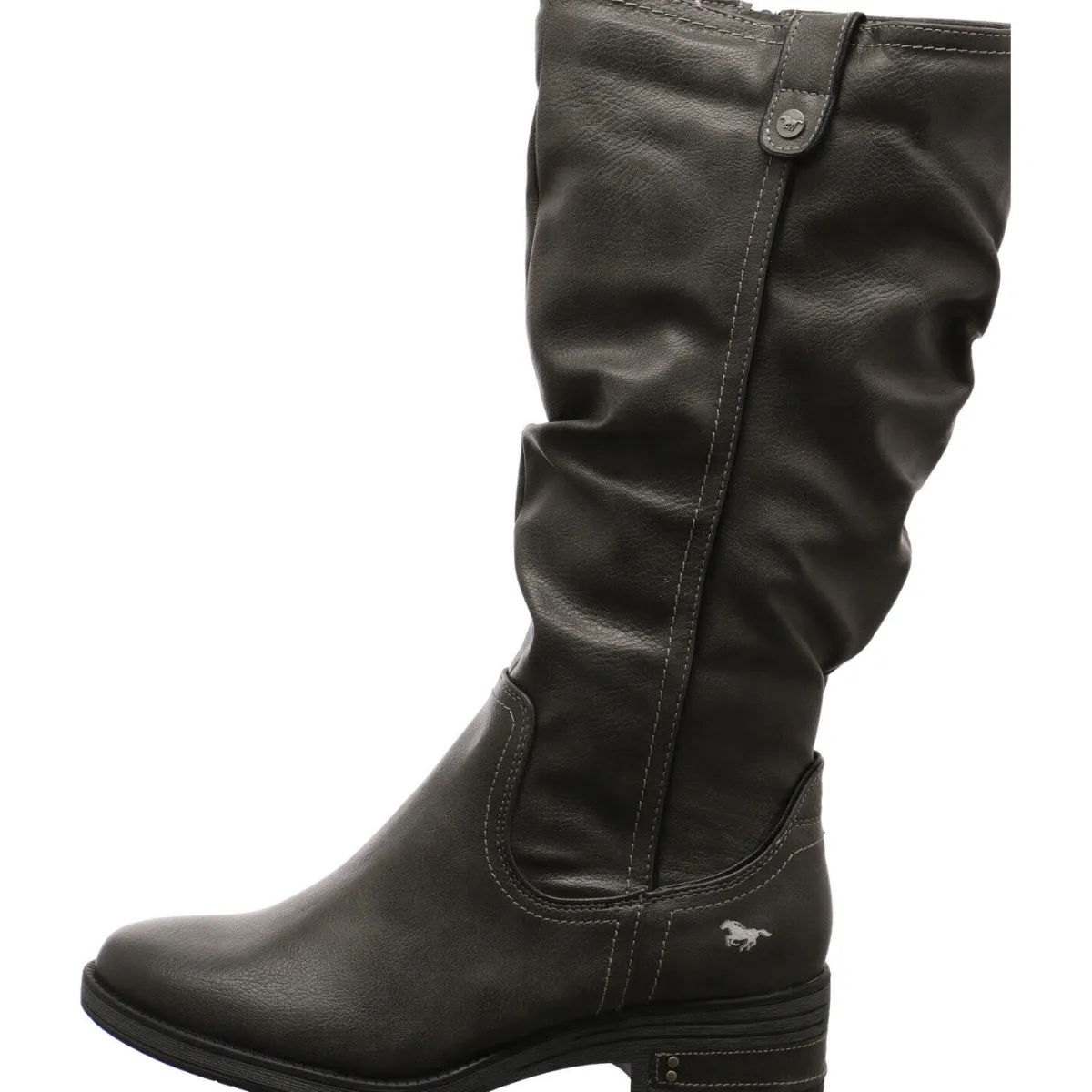 Gefertigt aus Kunstleder in Grau, ist der lange Schaft stilvoll in Falten gelegt. Ein kleiner Riemen am Schaftrand ist ein weiterer Hingucker.