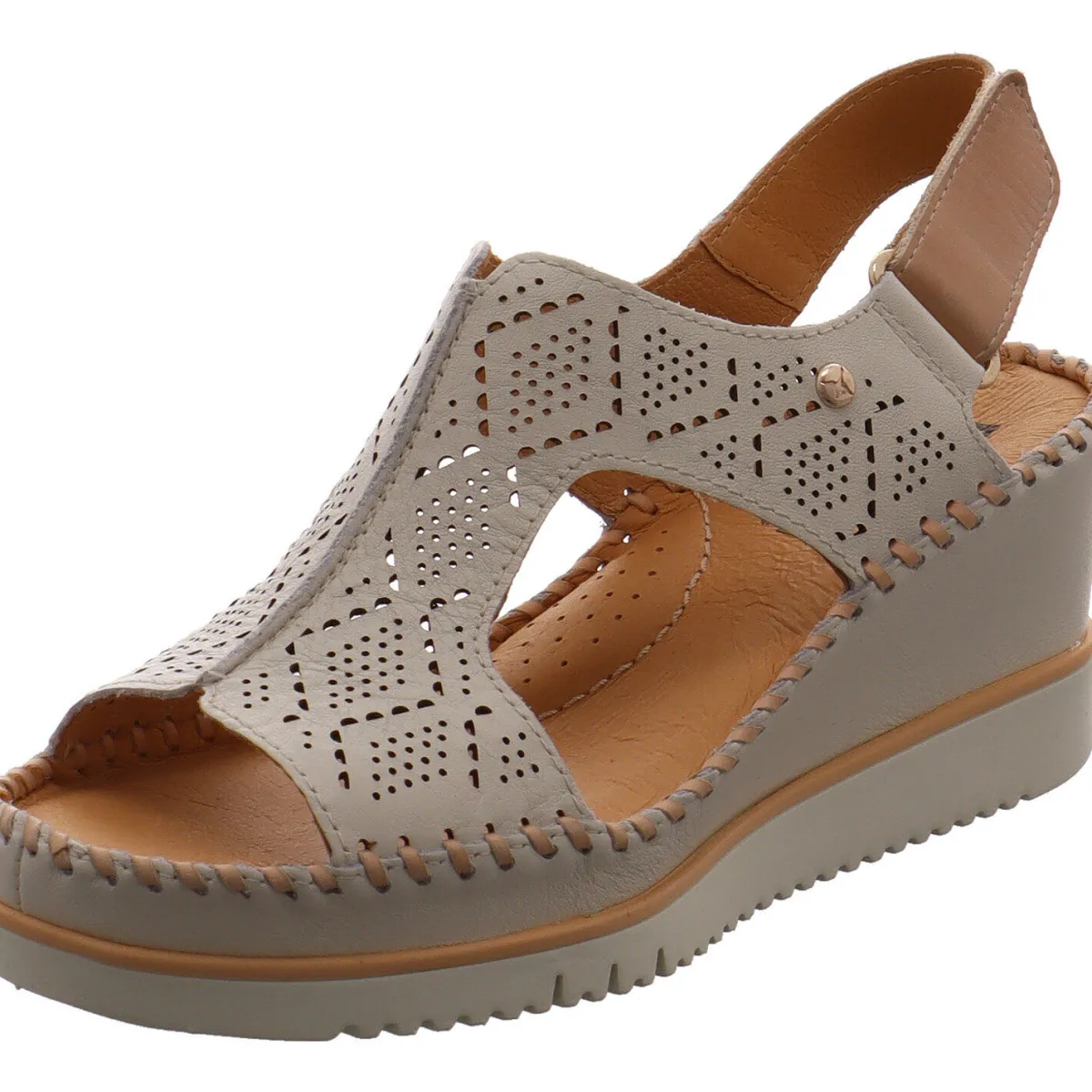 Per Hand aus weichem, hochwertigen Echtleder in Creme Weiß gefertigt, ist der Riemen besonders stilvoll angelegt und mit kleinen Lasercuts versehen. Diese sorgen, neben den Aussparungen für eine tolle Belüftung an heißen Tagen und machen den Schuh zum absoluten Eyecatcher. Durch den dezenten Klettverschluss an der Ferse ist der Einstieg besonders leicht. Der elegante Keilabsatz zaubert lange Beine und gibt dennoch einen guten Halt.