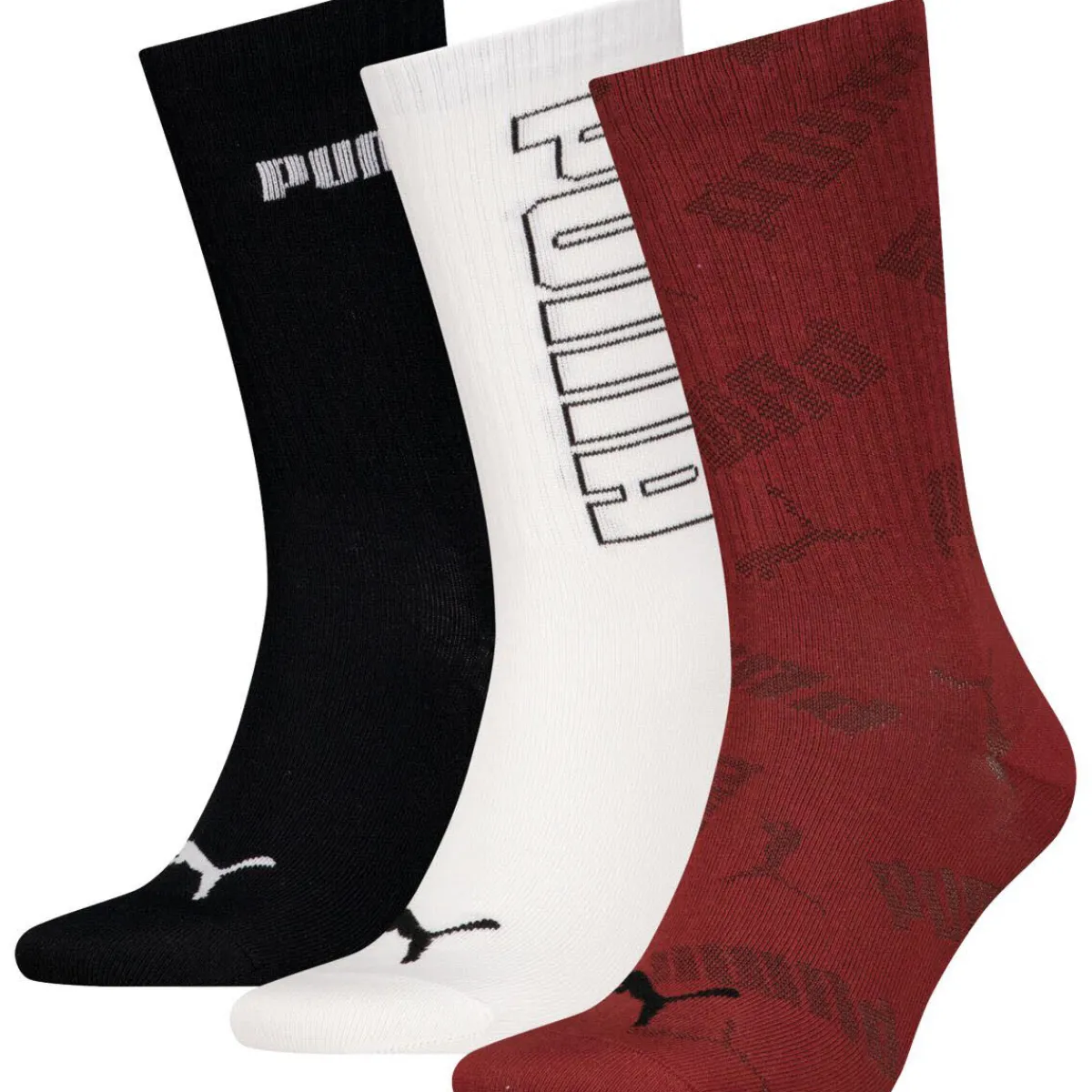 Das Set beinhaltet drei Paar in schwarz, weiß und rot mit verschiedenen Logoprints.