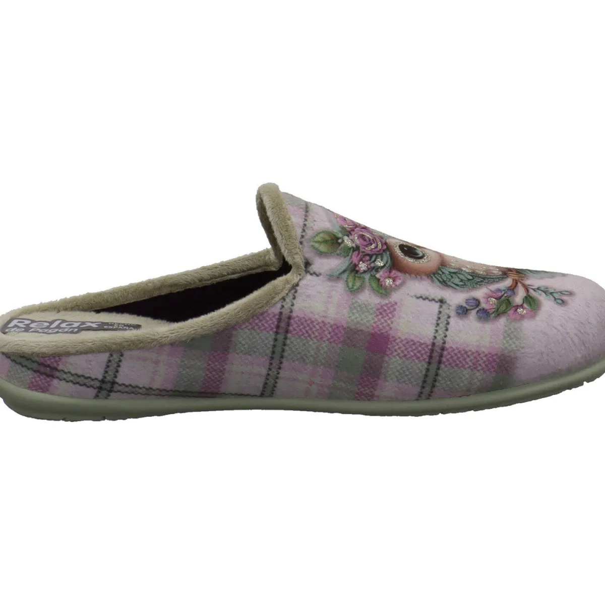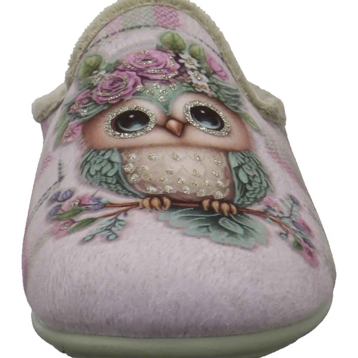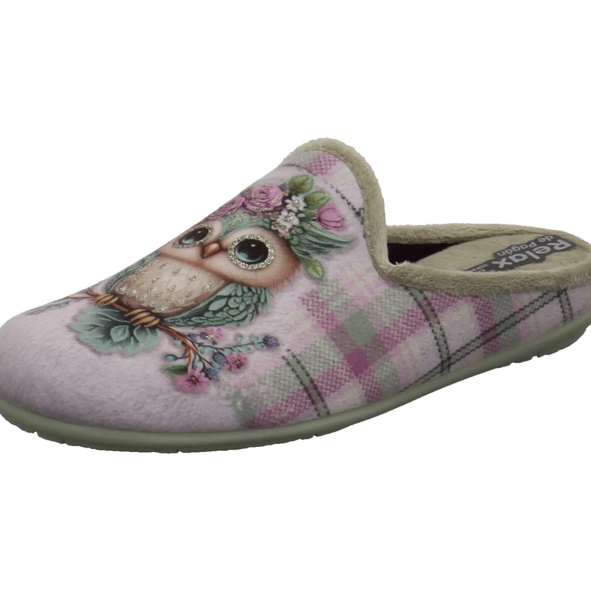 Er wurde aus angenehm weichen Textil in Grün gefertigt und ist mit einer süßen Eule mit Blumen auf dem Kopf und Glitzer verziert. Hinterlegt ist dieses süße Motiv mit einem Karo Muster in Grün mit Lila. Die Innensohle ist angenehm gepolstert und trägt zum Wohlfühlmoment bei. Die Gummisohle gibt perfekten Halt, so kommst du auch auf glatten Böden nicht ins Rutschen.